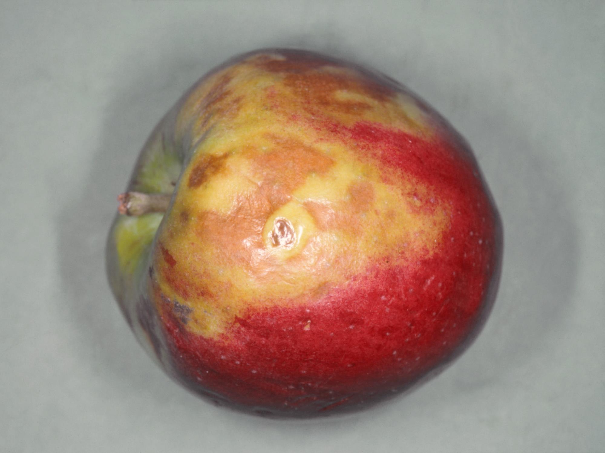 Description: L’épiderme d’une pomme (cv 'Cortland') montre des zones brunes dont la marge est irrégulière et diffuse et couvrant 60 à 75 % de la surface du fruit, principalement la partie verte. Le fruit est ferme et la chair est sans symptôme. Aucun agent pathogène n’a été détecté des lésions. Les symptômes s’apparentent à ceux de l’échaudure, car le brunissement est irrégulier et diffus, principalement localisé sur la partie verte du fruit et ne pénètre pas dans la chair.