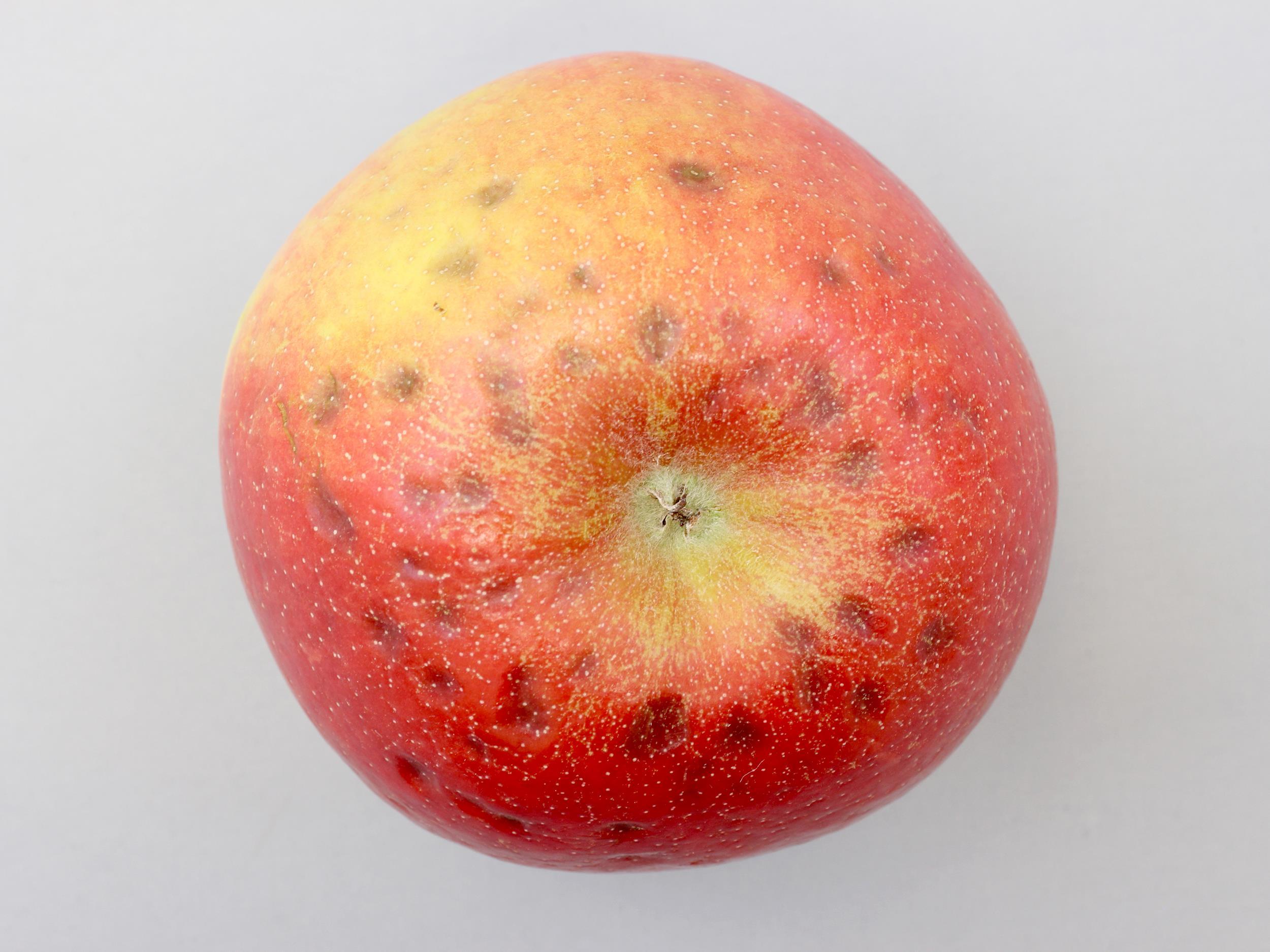 Description: Une pomme (cv 'Honeycrisp') montre de petites taches foncées, d'un diamètre de 2 à 4 mm, circulaires, légèrement enfoncées, et toutes localisées dans la région du calice (œil). L'apparence des taches est due aux cellules déshydratées brunes et liégeuses situées immédiatement sous l'épiderme. Les fruits les plus gros présentaient ce type de tache. Ces symptômes sont caractéristiques de la tache amère.