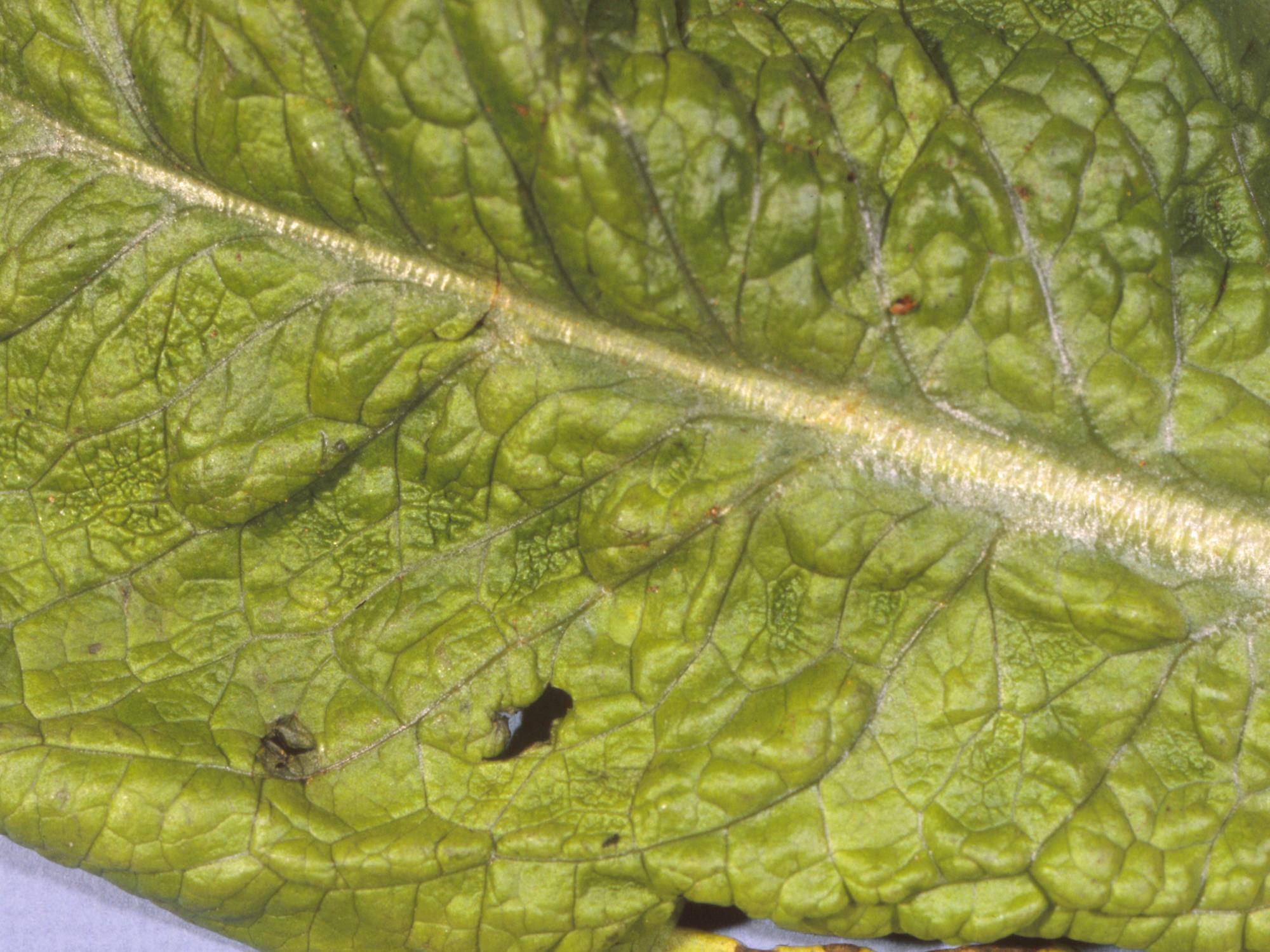 Description: Une vue rapprochée de la face supérieure d’une feuille de laitue romaine cultivée en serre montre un gaufrage du limbe près de la nervure principale. Il est possible que le gaufrage des feuilles ait été causé par du gel. Les plants de laitue reçus étaient cultivés sans éclairage artificiel ni chauffage du sol et faisaient partie d’un protocole de recherche. L’échantillon a été reçu au Laboratoire d’expertise et de diagnostic en phytoprotection à la fin janvier.