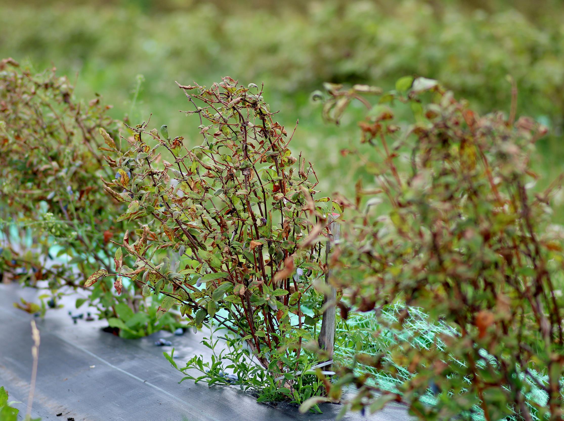 Description: Cette photo prise à la mi-juillet montre la faible reprise des plants de camérisiers à la suite d'un gel printanier. Les plants sont chétifs et le feuillage est brunit et peu abondant.