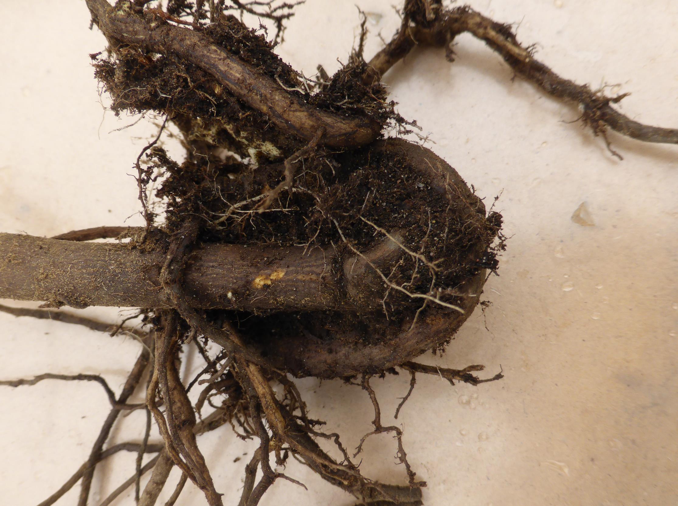Description: Les racines sur ce plant sont peu ramifiées, remontent en surface et présentent une spiralisation. Les racines enroulées ne peuvent pas s'étendre, ce qui empêche la plante de bien s'ancrer dans le sol.