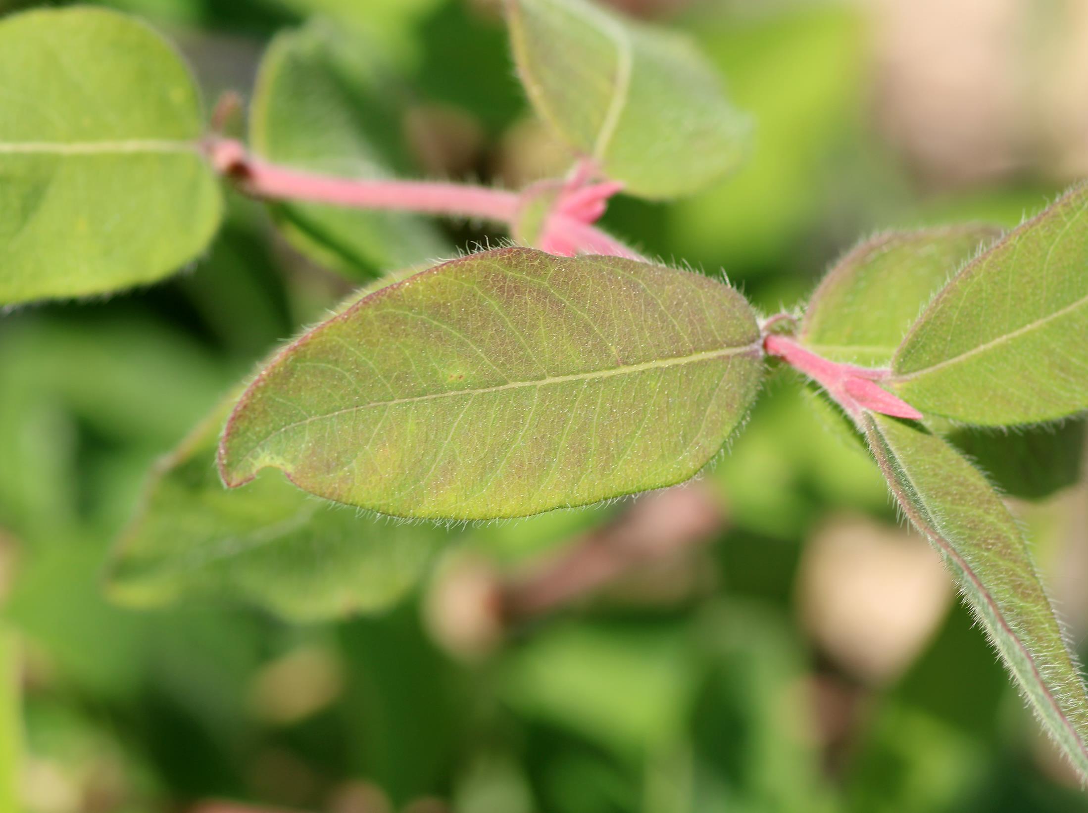 : Coloration rouge internervaire, symptôme d'une carence en azote sur une feuille de camérisier.