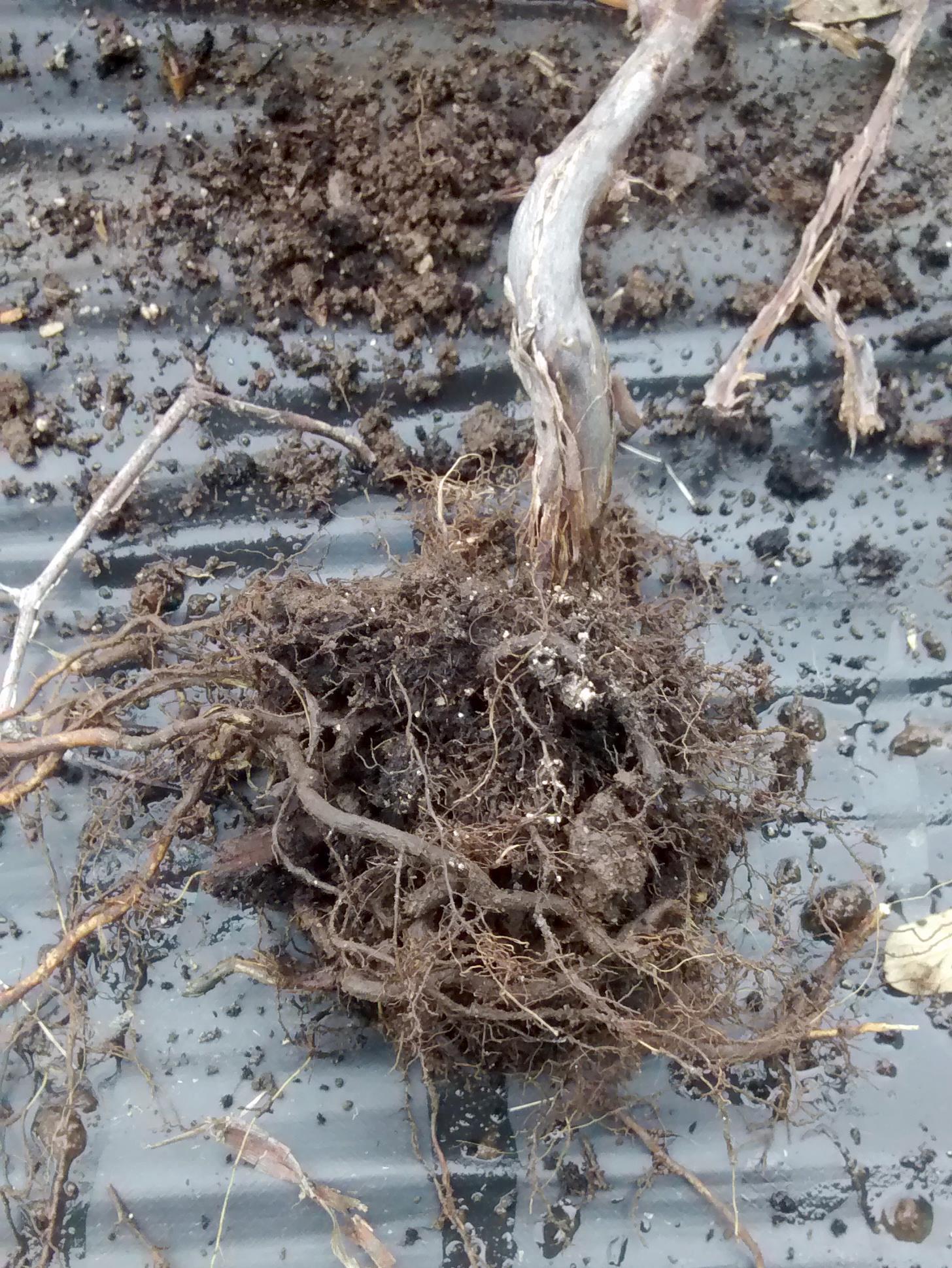 : Racines de camérisier brûluées par l'engrais granulaire mal distribué.