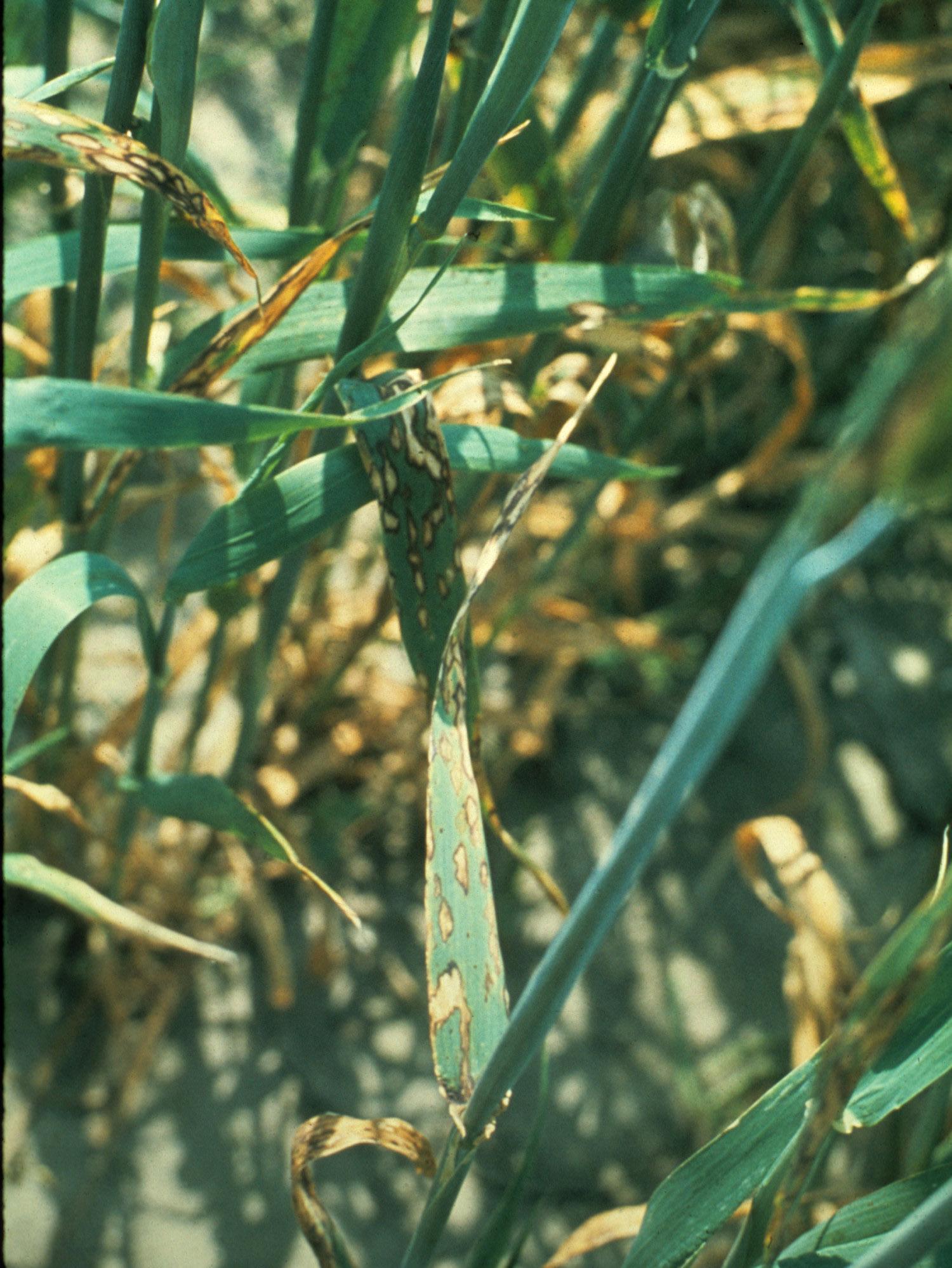 Description: Sur des feuilles de blé de printemps, présence de taches ovoïdes beiges à contour irrégulier brun. Ces taches se développent le long des nervures. Les tests de laboratoire ont révélé la présence du champignon Pyrenophora tritici-repentis, responsable de la tache auréolée chez le blé.