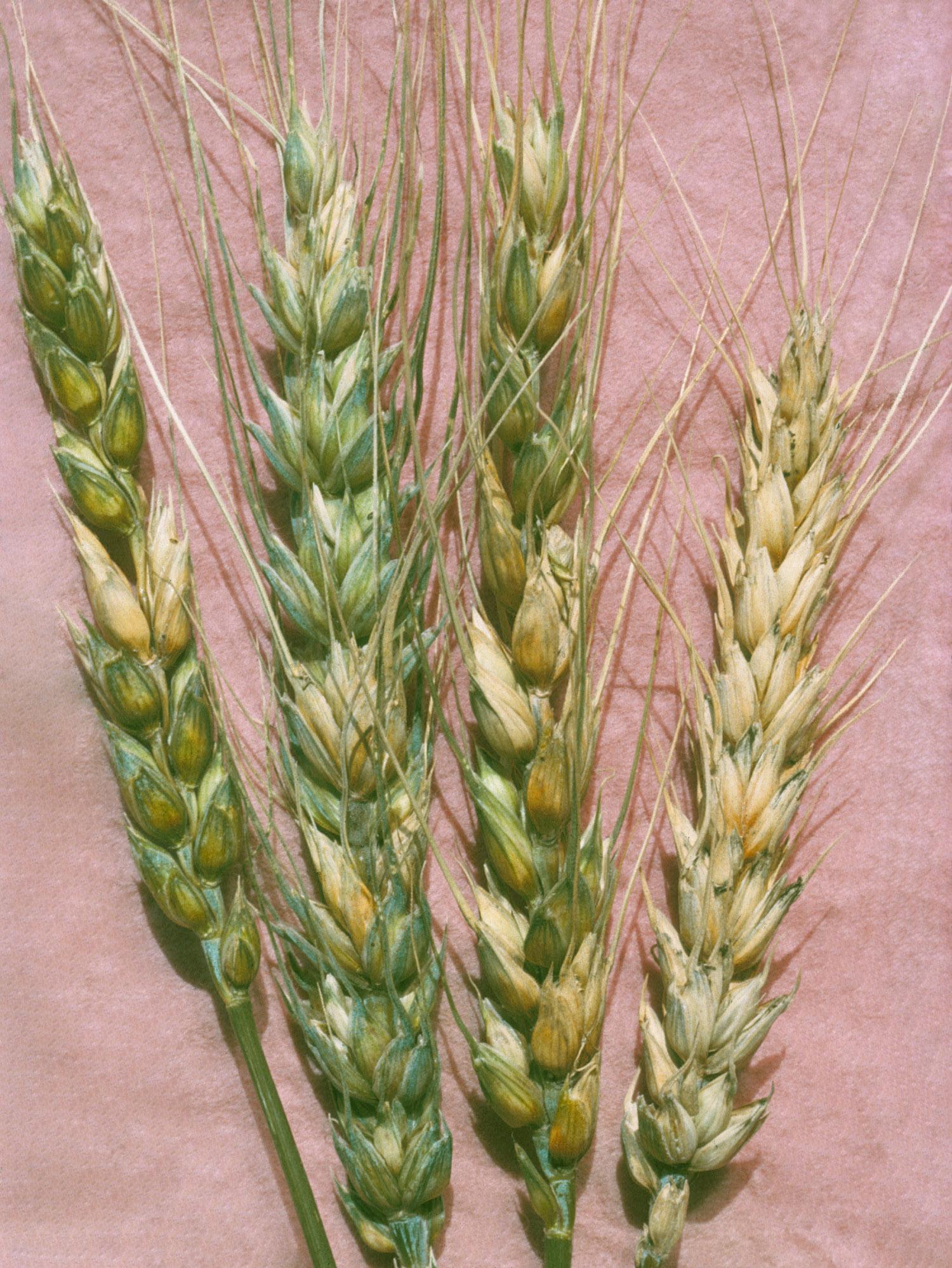 Description: Sur des épis de blé de printemps, présence d’épillets décolorés sur les épis verts. L’épi de droite est plus affecté par la maladie et a un faible développement, lorsque comparé aux autres. Ces symptômes sont caractéristiques de la fusariose de l’épi chez le blé. Cette maladie est causée principalement par le champignon Fusarium graminearum.