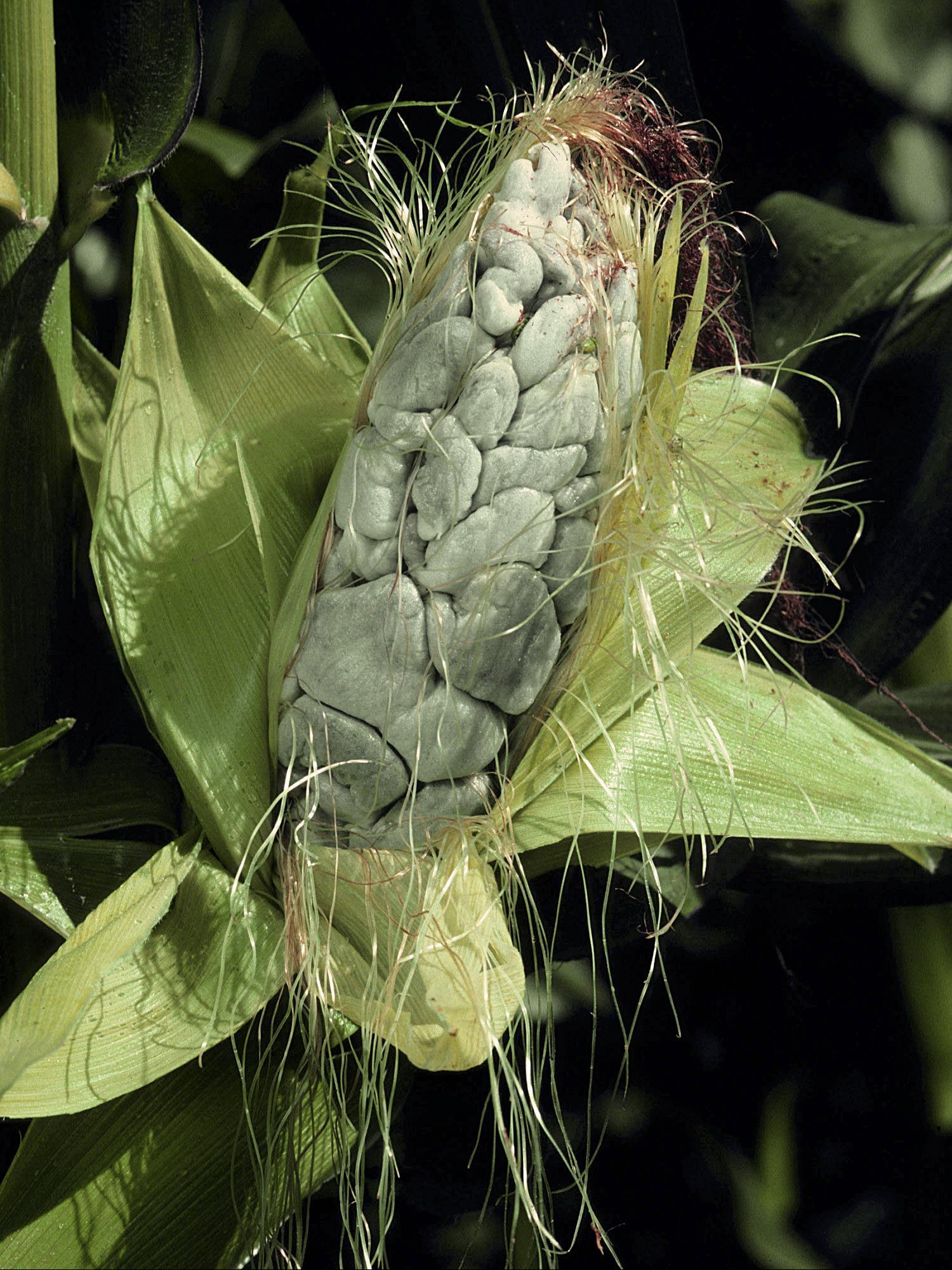 Description: Sur cet épi de maïs grain et fourrager, les grains sont remplacés par des tumeurs couvertes d’une membrane grisâtre. Les tests de laboratoire ont révélé la présence du champignon Ustilago maydis, responsable du charbon commun chez le maïs.