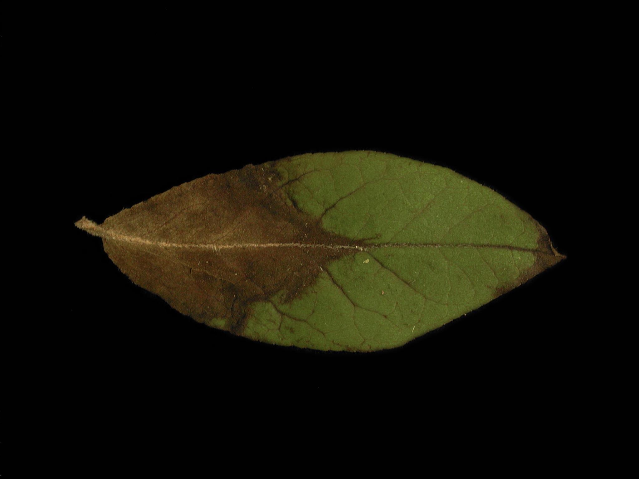 Description: Sur une feuille de bleuet en corymbe, présence d’un brunissement ou d’une brûlure souple du limbe. Le brunissement prend la forme d’un « V » le long des nervures. Les tests de laboratoire ont révélé la présence du champignon Monilinia vaccinii-corymbosi, responsable de la pourriture sclérotique.
