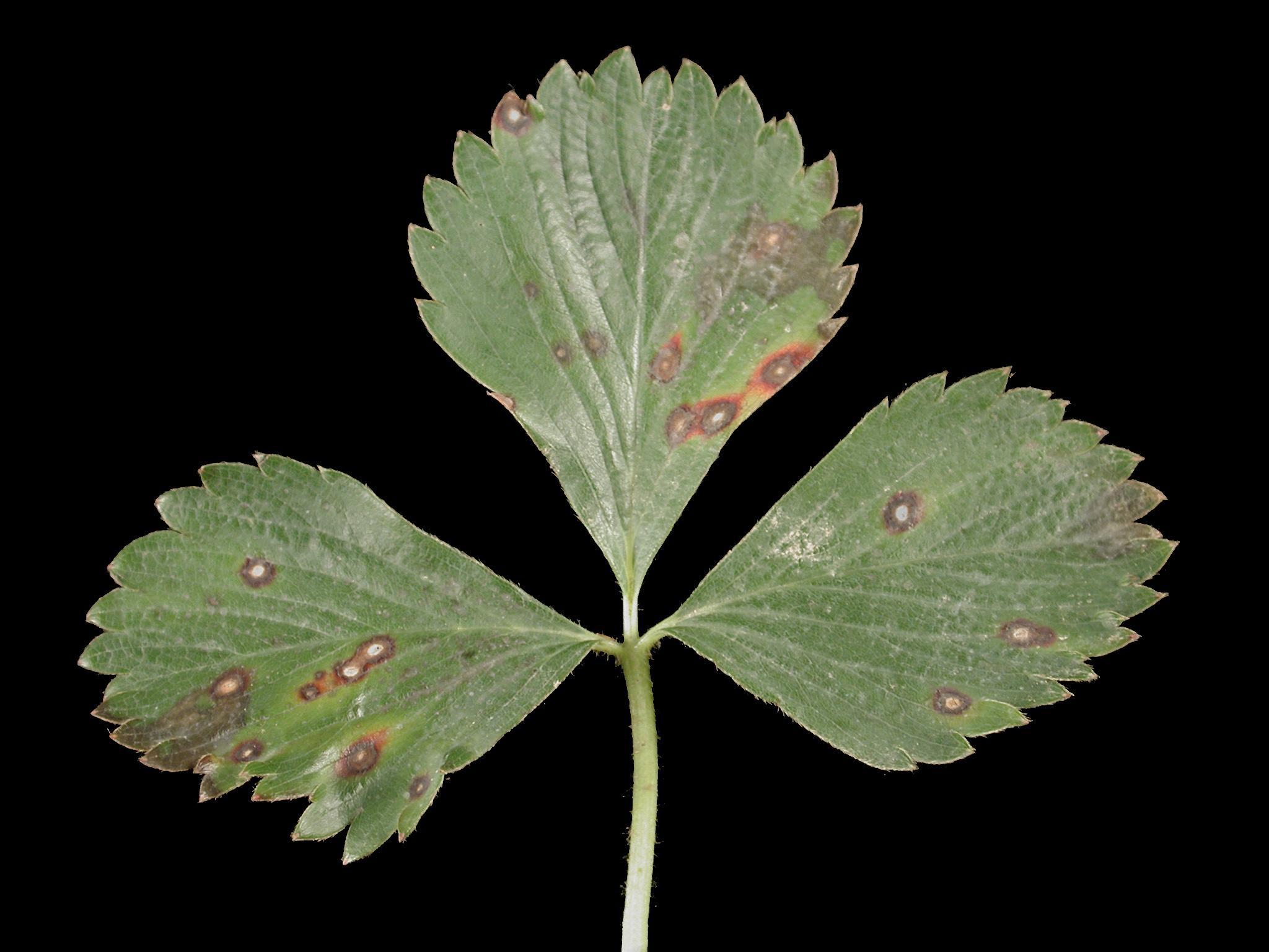 Légende: Taches pourpres avec un centre blanc sur feuille de fraisier