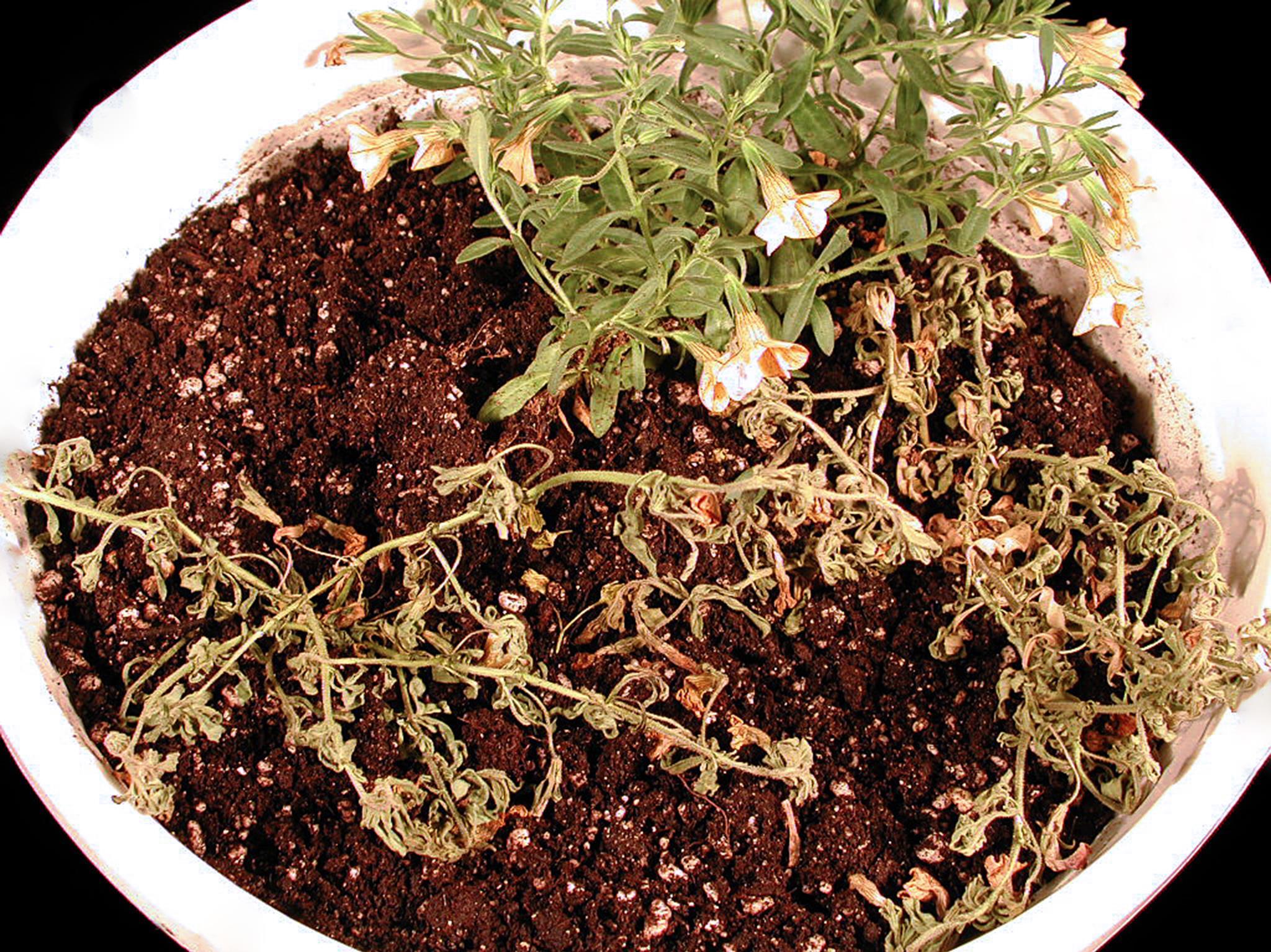 Description: Les calibrachoas (Million Bells 'Terracotta') présentent un flétrissement de la partie terminale des tiges avec un léger jaunissement des vieilles feuilles. Les feuilles médianes et terminales sont vert foncé. Le collet des plants affectés est noir et la masse racinaire est réduite et noirâtre (non visible ici). Les observations microscopiques ont révélé la présence du champignon Berkeleyomyces basicola (syn. Thielaviopsis basicola), responsable de la pourriture noire des racines.