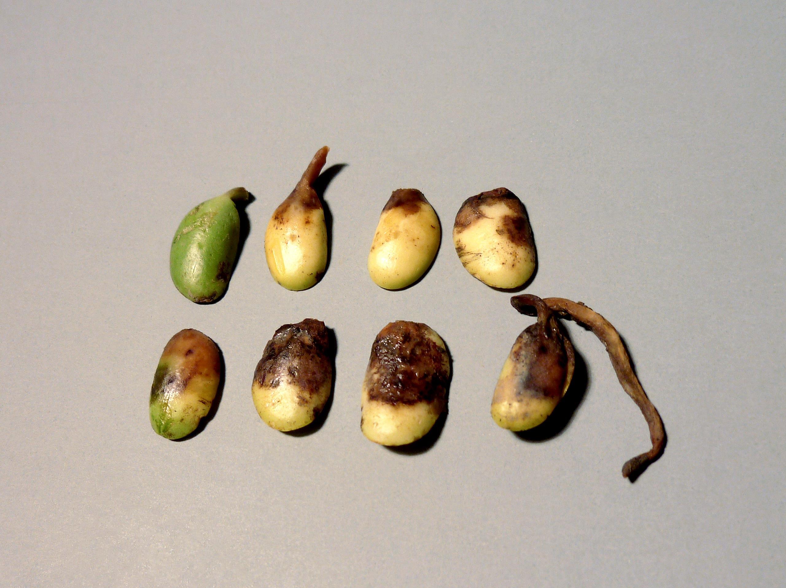 Description: Sur des cotylédons de soya, présence de taches brun foncé, d’une dimension variable, et d’une pourriture brune. Les tests de laboratoire ont révélé la présence de Phytophthora sojae, responsable de la fonte des semis chez le soya.