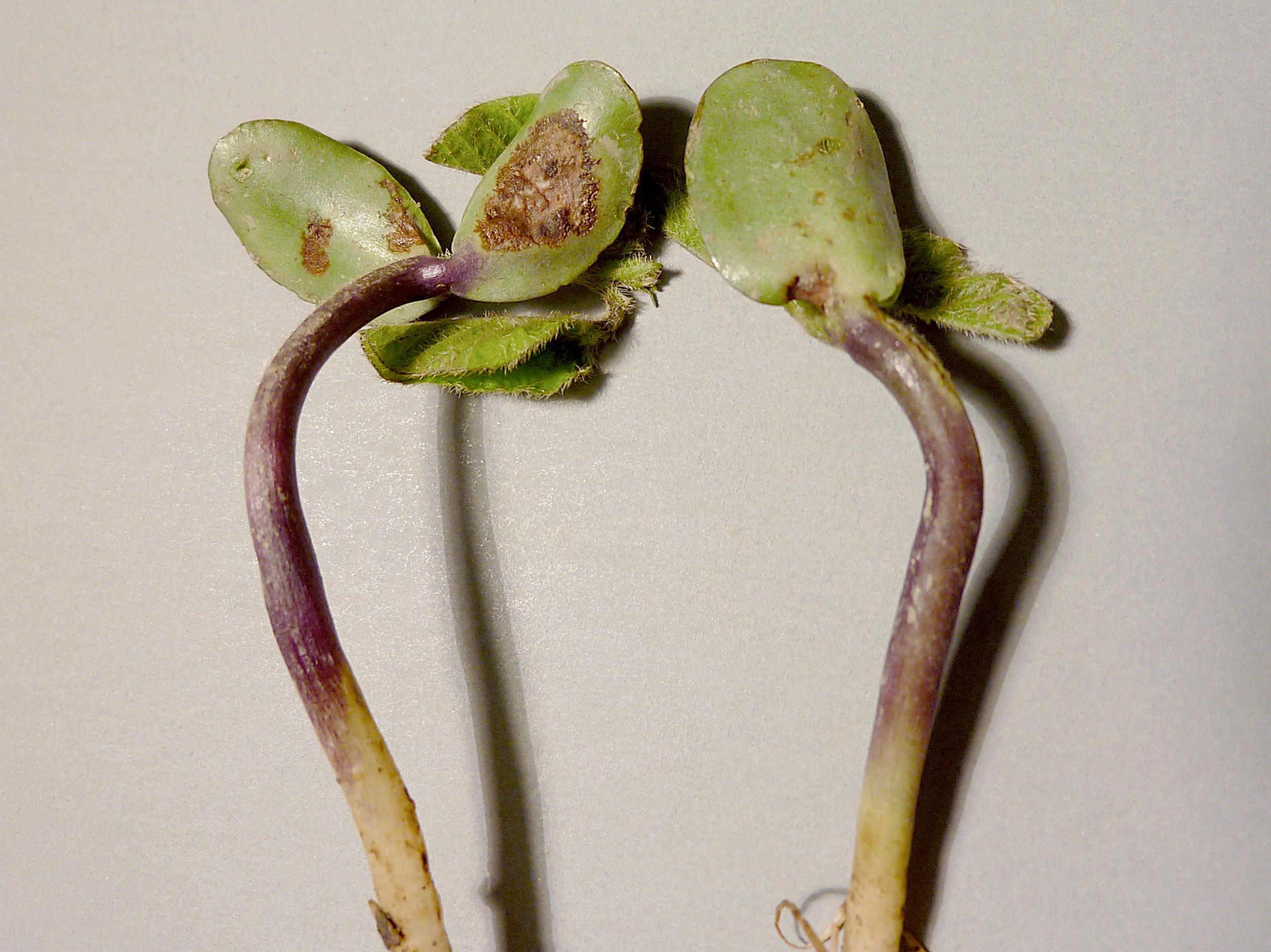 Description: Sur des cotylédons de soya, présence de taches brun foncé, d’une dimension variable, et d’une pourriture brune. Les tests de laboratoire ont révélé la présence de Phytophthora sojae, responsable de la fonte des semis chez le soya.   Le conseiller agricole mentionne que cette production biologique est cultivée dans un sol argileux au drainage déficient, que plus de 50 % des plants sont affectés et que des pluies abondantes ont été enregistrées depuis le début de la saison (avant mi-juin 2014).