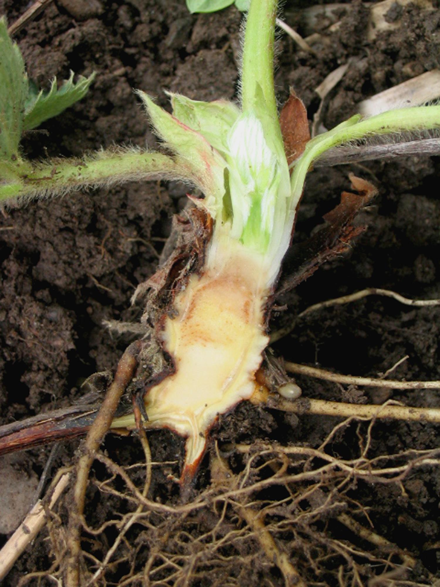 Description: Un collet de fraisier montre une coloration rougeâtre à brunâtre des tissus internes dans la partie supérieure. Le système vasculaire est le plus affecté tandis que la moelle est ponctuée de rouge. Ce symptôme est le premier dommage causé par Phytophthora cactorum, responsable de la pourriture des racines et du collet chez le fraisier.