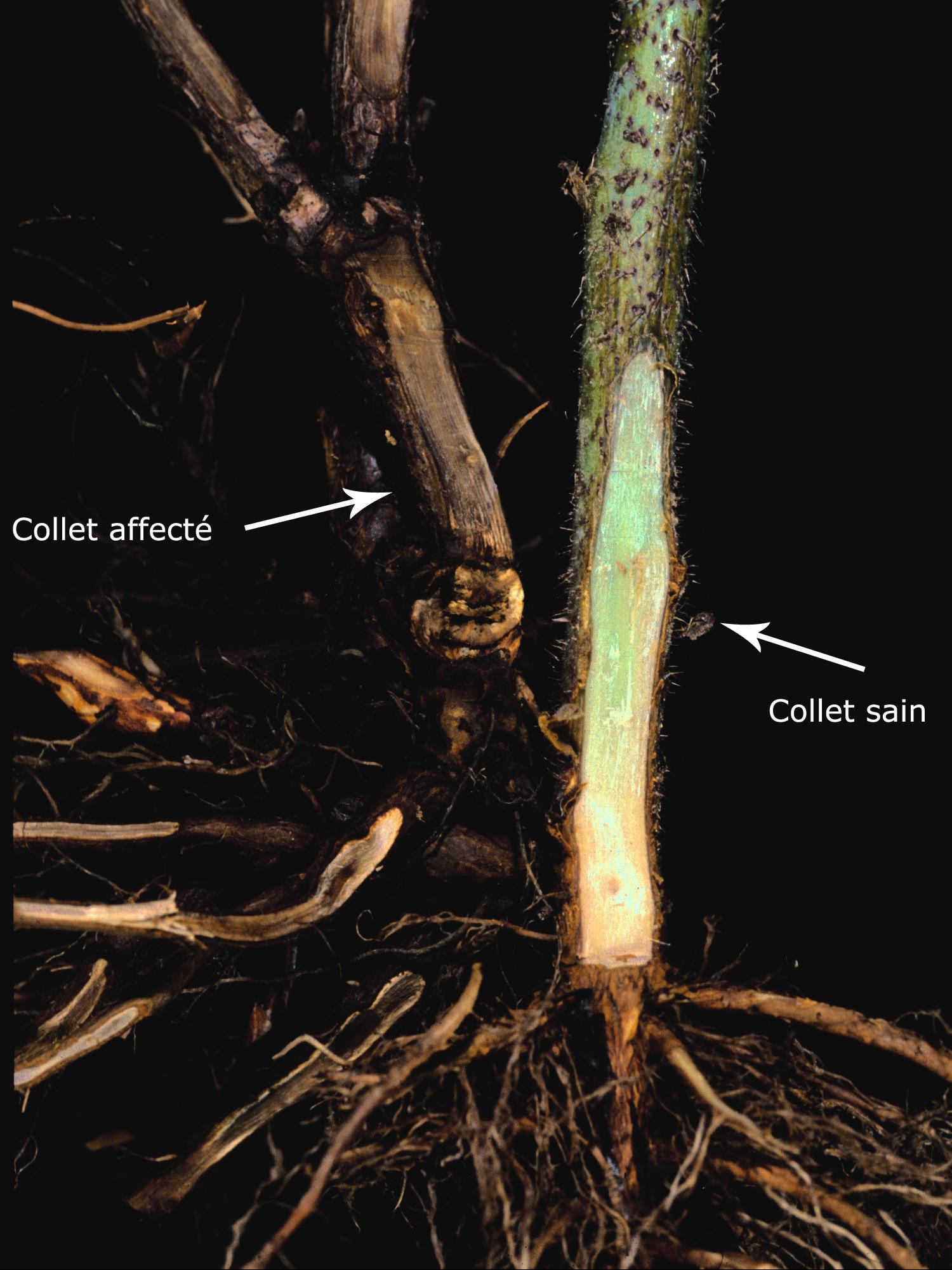 Légende: Comparaison entre un collet de framboisier sain et affecté