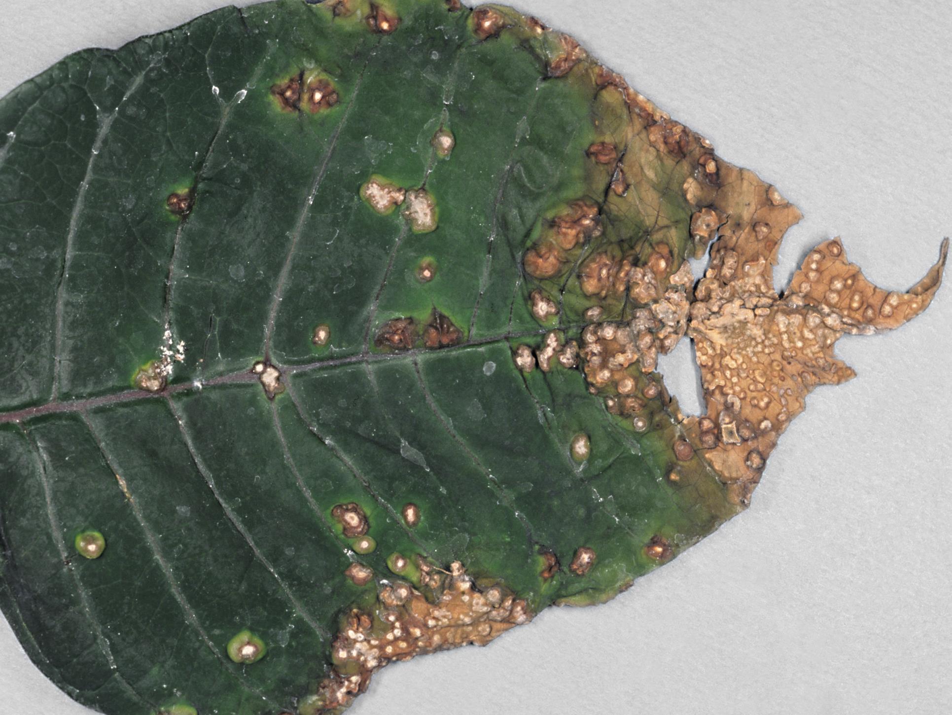 Description: Une feuille de poinsettia montre des taches blanches avec une marge brune et un halo vert pâle. Le diamètre des taches varie entre 2 et 4 mm. Certaines taches sont surélevées. Les taches ont tendance à se regrouper pour former des brûlures localisées à l’apex et/ou à la marge. Les tests de laboratoire ont révélé la présence du champignon Sphaceloma poinsettiae, responsable de l’anthracnose chez le poinsettia.