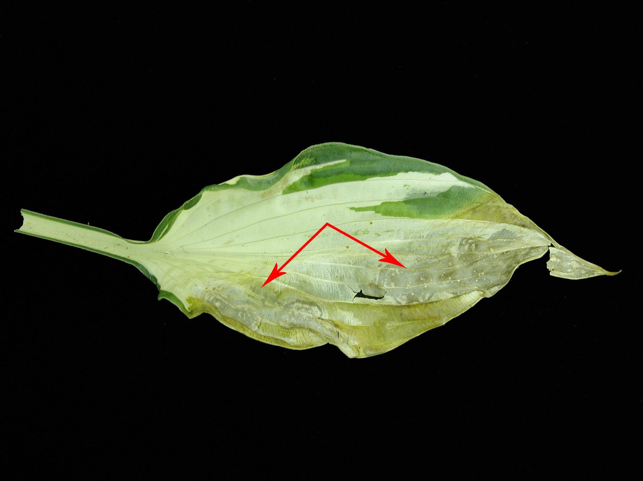 Description: Une feuille d’hosta montre des taches plutôt circulaires, beiges à grisâtres, d’une apparence sèche et dont les tissus ont une apparence de papier (voir flèches). Le diamètre moyen des taches est de 8 mm. Il se développe par la suite de grandes brûlures débutant à l’apex et les tissus deviennent secs. Les observations microscopiques ont révélé la présence de pycnides et de spores du champignon Colletotrichum sp., responsable de l’anthracnose.