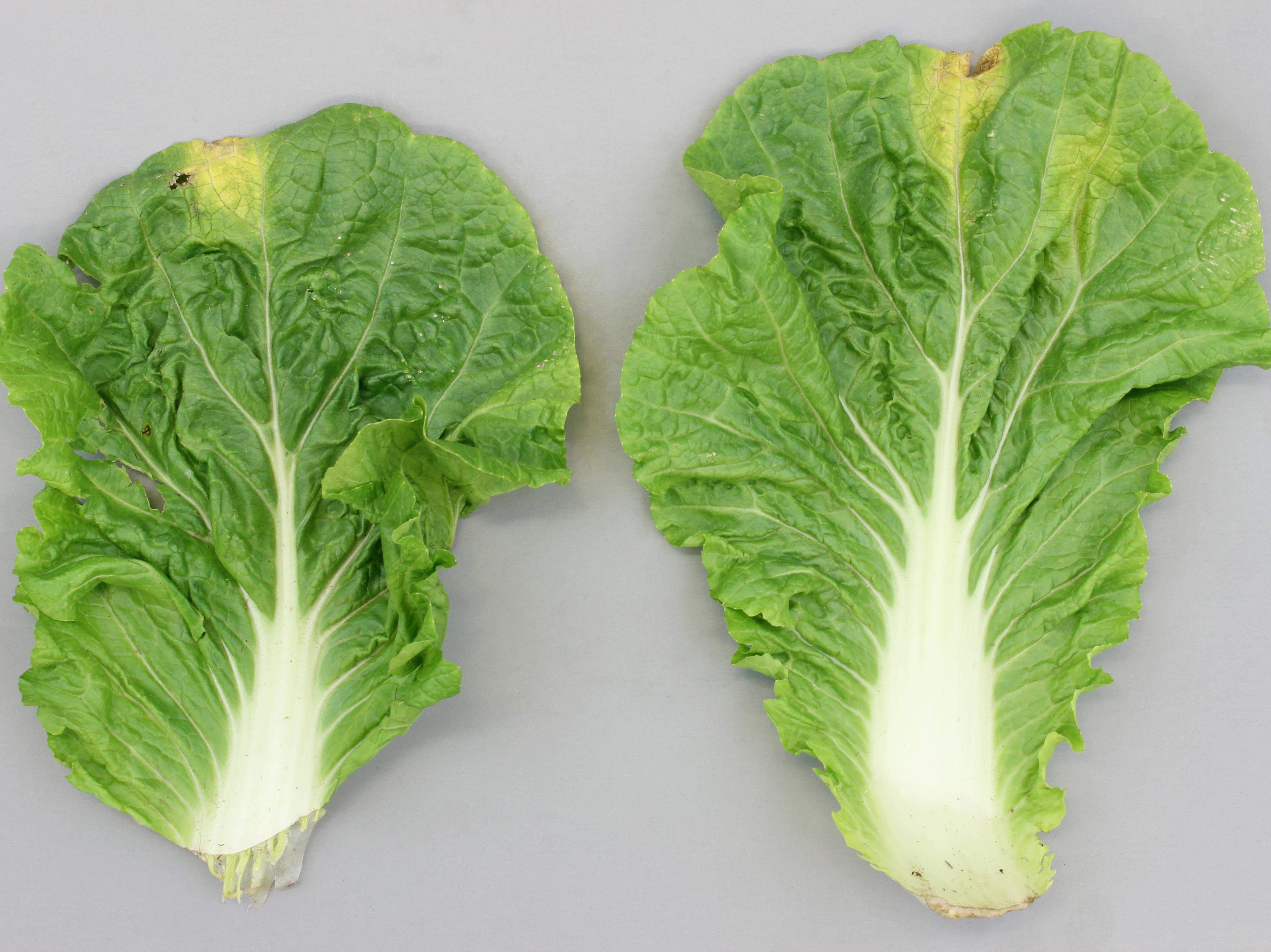 Légende: Jaunissement en forme de « V » débutant à l’apex des feuilles de chou chinois