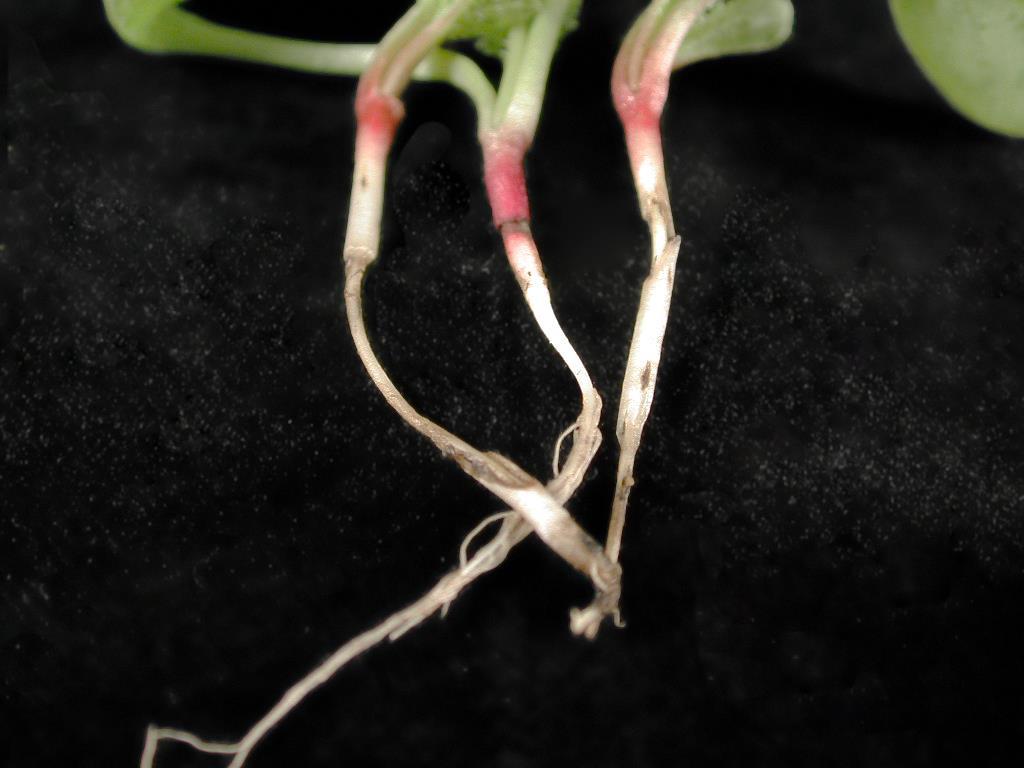 Cette culture était un semis direct réalisé le 7 mai 2001 et l’échantillon a été acheminé au Laboratoire de diagnostic en phytoprotection deux semaines plus tard (22 mai 2001). Durant cette période, la température était élevée et la culture n’était pas irriguée. Le semis de radis s’est fait sur un retour de carotte qui est une culture sensible à Rhizoctonia solani et R. carotae.