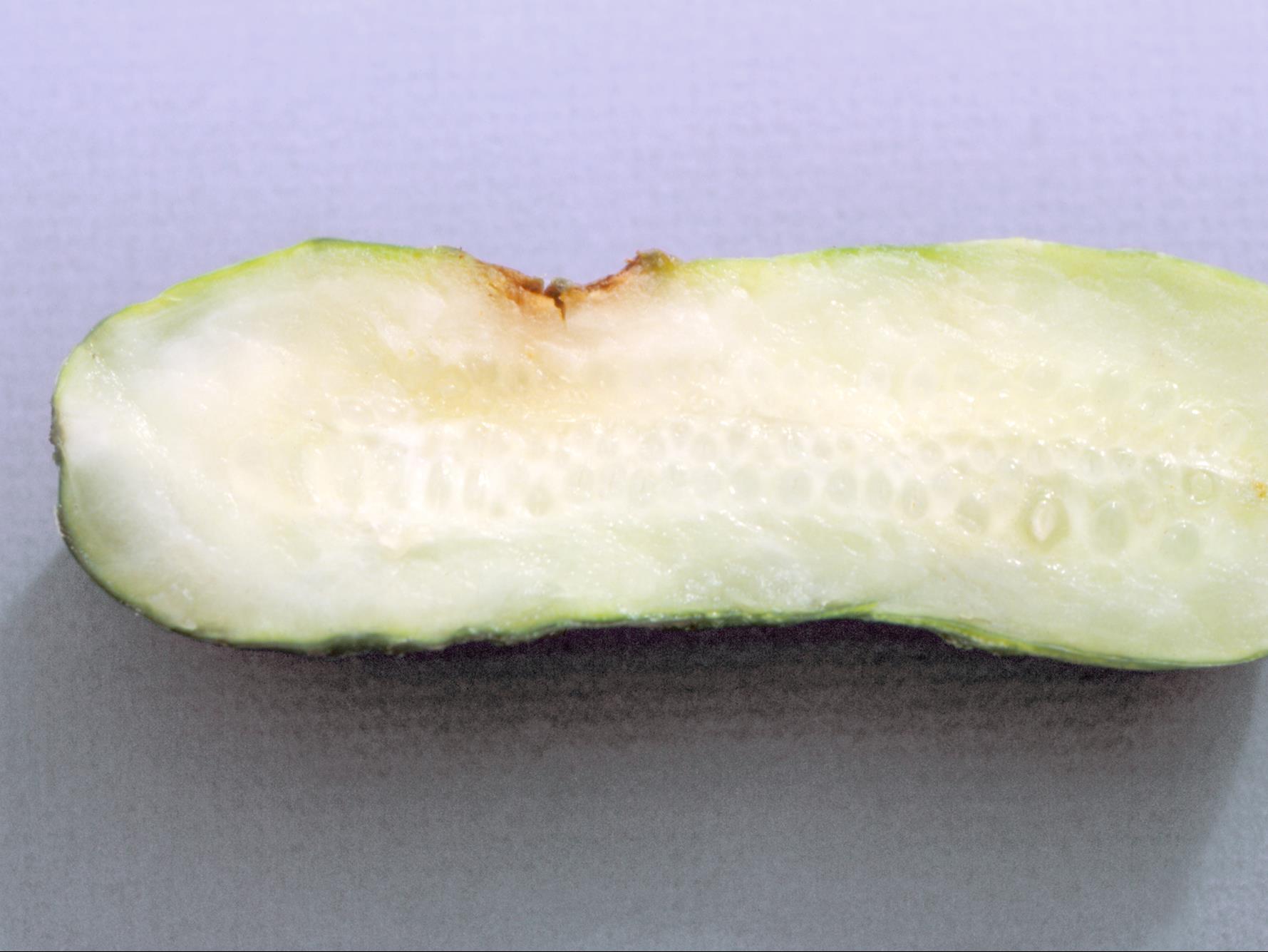 Description: Sur un concombre de transformation (cornichon) provenant d’un champ, présence d’une tache qui pénètre un peu dans la chair. La chair est légèrement affectée. L’épiderme du concombre avait de grandes taches ou lésions brunes à orangées, irrégulières, déprimées et d’une apparence humide mais ferme (non visible ici). Les observations microscopiques ont révélé la présence du champignon Rhizoctonia solani, responsable du rhizoctone commun.