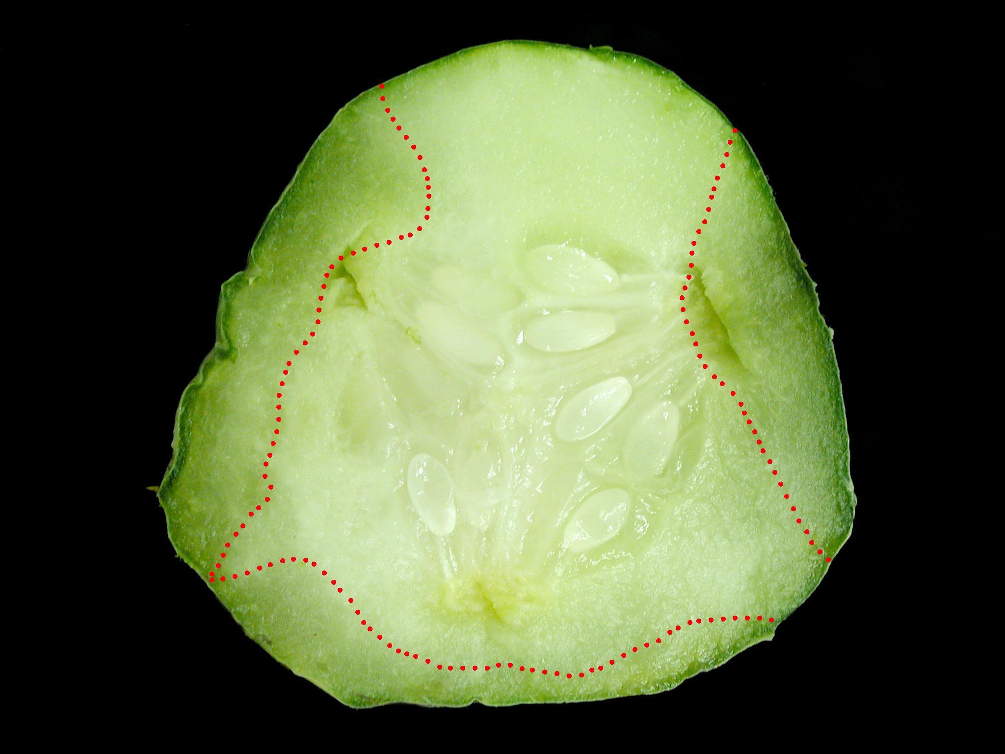 Description: Ce concombre de transformation (cornichon) présente de grandes zones de pourriture molle sur l'épiderme et sous celui-ci, la chair est aqueuse (voir lignes pointillées). Une forte odeur acidulée émanait de la pourriture et sous l'épiderme, la chair était aqueuse (non visible ici). Les tests de laboratoire ont révélé la présence de sporanges caractéristiques de Phytophthora capsici, responsable du dépérissement phytophthoréen chez les cucurbitacées.