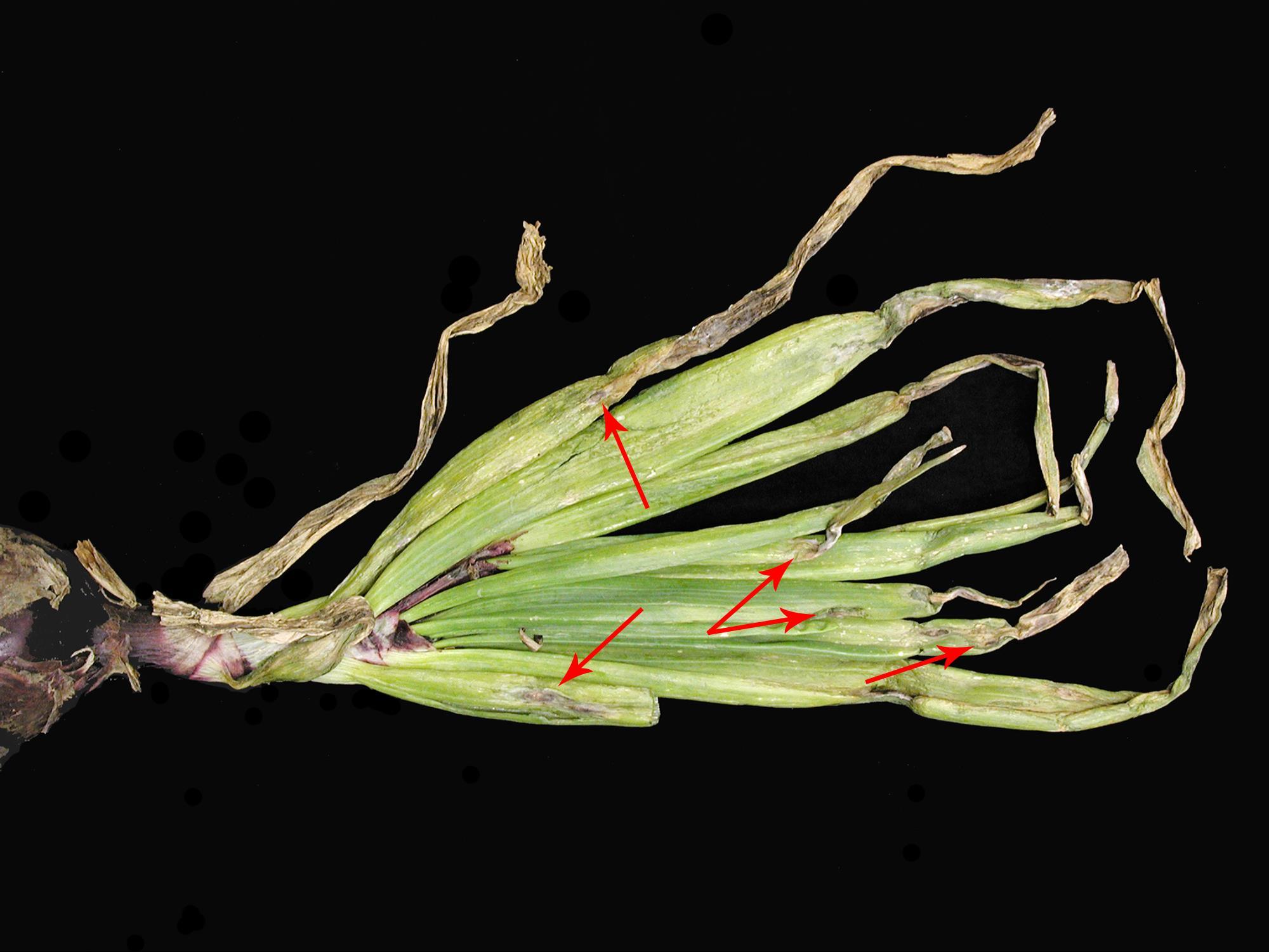 Description: Sur un plant d'oignon espagnol (cv 'Red Fortress') provenant d’un champ, toutes les feuilles présentent des brûlures à leur extrémité. Immédiatement sous ces brûlures, il y a de grandes taches pourpres (voir flèches) mesurant plusieurs cm de diamètre. Les tests de laboratoire ont révélé la présence de mycélium et de conidies du champignon Alternaria porri, responsable de la tache pourpre chez l’oignon. Notez que le champignon Stemphylium sp. a été observé sur les feuilles. Il envahit souvent les dommages causés par A. porri.