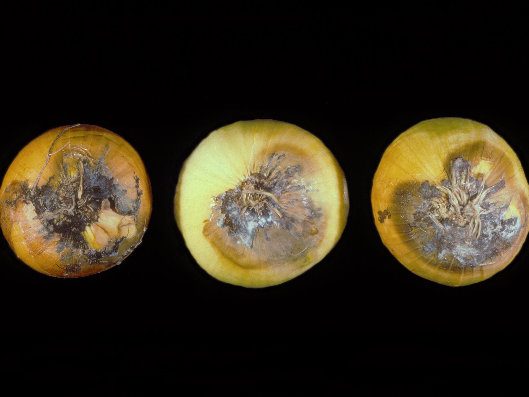Légende: Pourriture et mycélium blanc sur bulbes d'oignon sec