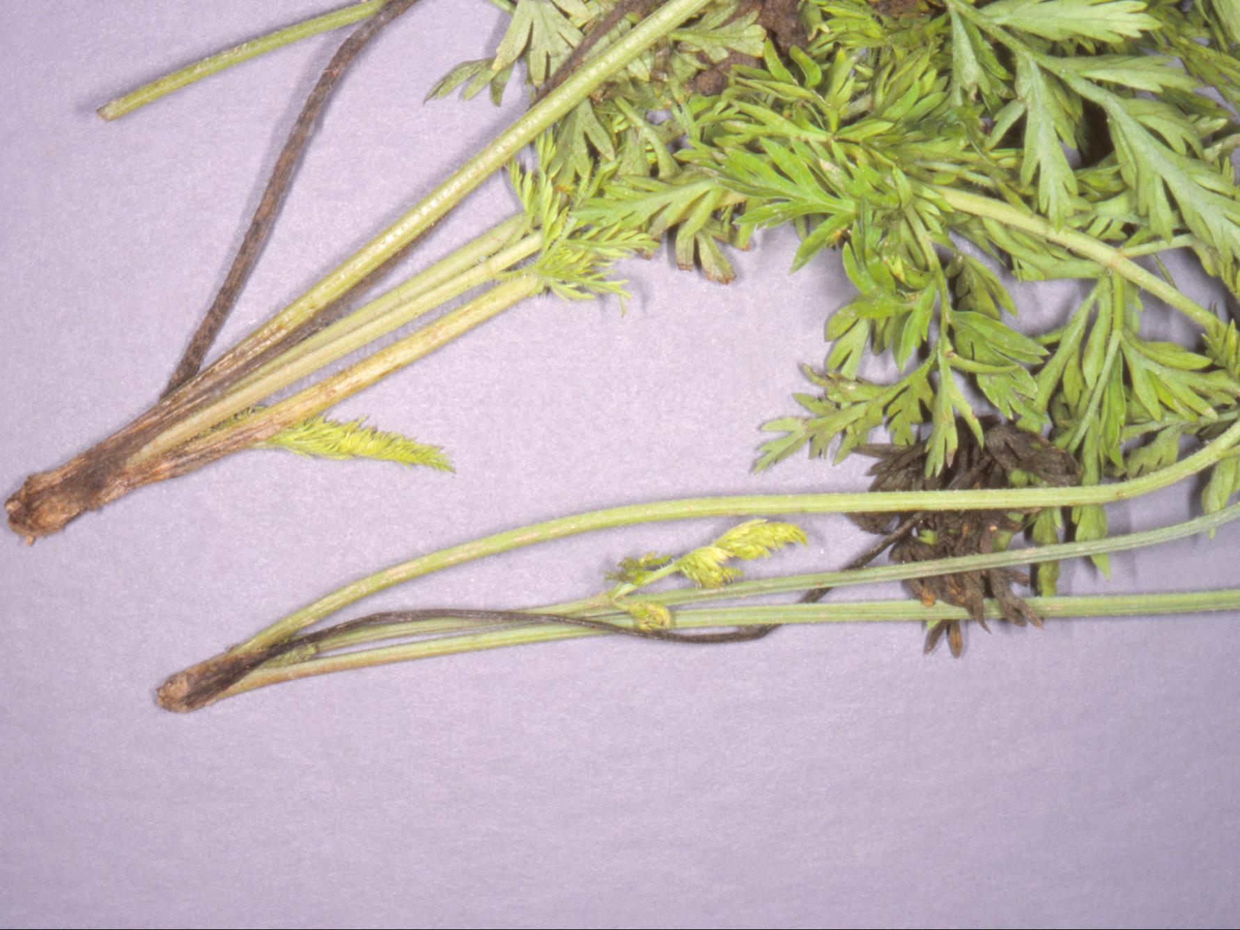 Description: Sur des plants de carottes (cv 'Choctaw') provenant d’un champ, présence de chancres secs au collet. Les collets sont rompus et cariés. Les tests de laboratoire ont révélé la présence du champignon Rhizoctonia solani, responsable du rhizoctone commun. Le conseiller agricole mentionne qu’au champ, les plants affectés étaient localisés en petits foyers, dans une baissière dont le sol avait un drainage passable.