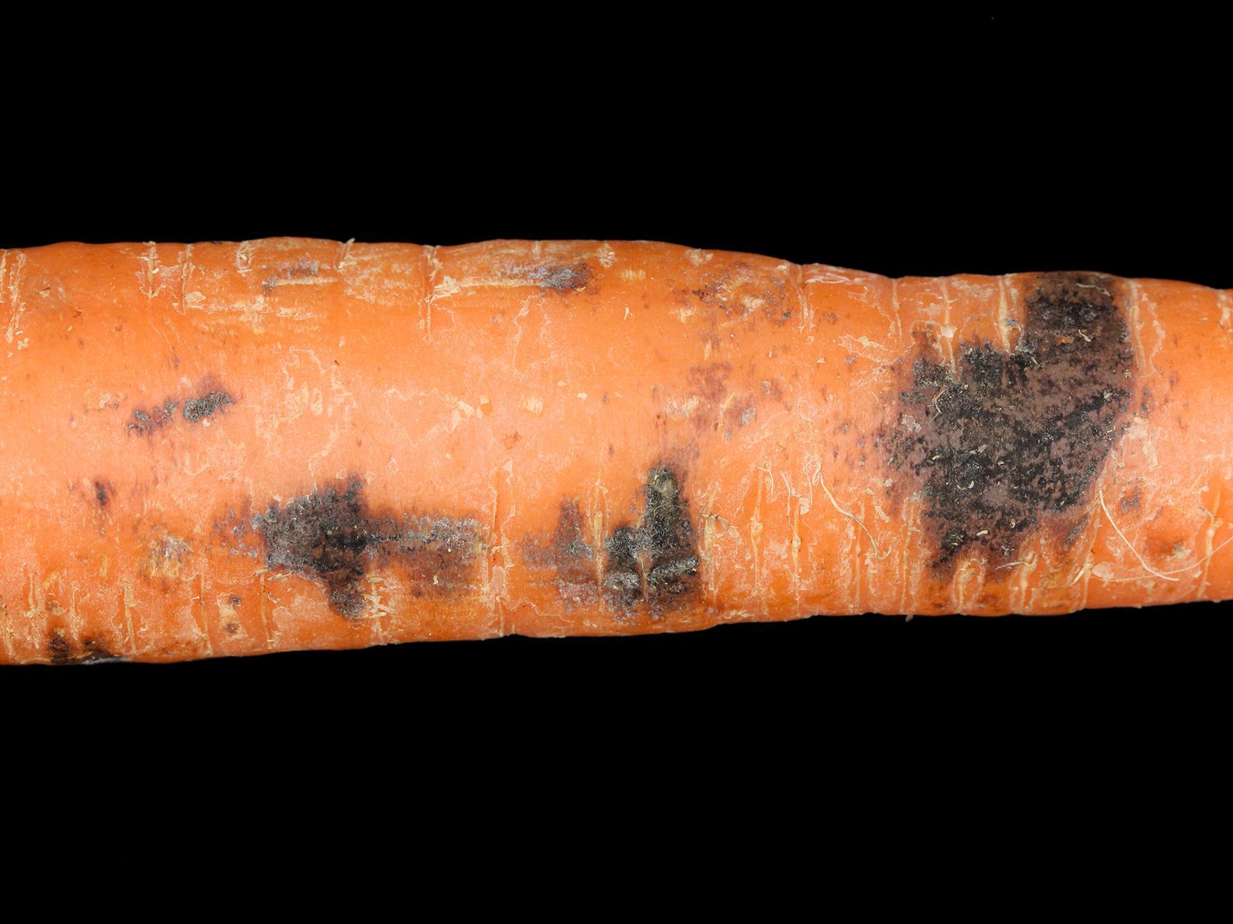 Description: Sur l’épiderme d'une carotte provenant d’un champ, présence de lésions noires, superficielles et irrégulières. Les observations microscopiques ont révélé la présence de chlamydospores du champignon Berkeleyomyces basicola (syn. Thielaviopsis basicola), responsable de la pourriture noire des racines.