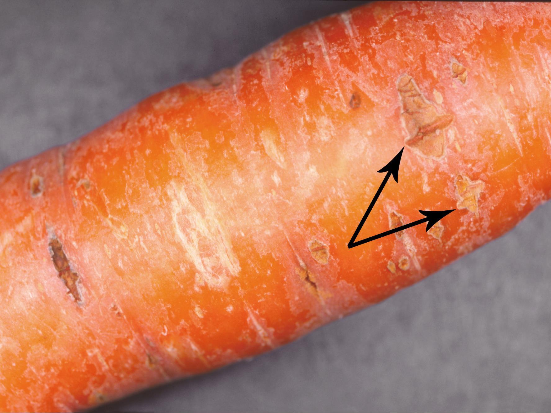 Description: Sur une carotte provenant d’un entrepôt, présence de lésions brunes, elliptiques, au contour bien délimité, déprimées et ayant un aspect cicatrisé ou liégeux. Ces lésions mesurent entre 5 et 10 mm de longueur par 3 mm de largeur. Elles sont disposées horizontalement sur la racine pivot et distribuées au hasard. Un fendillement longitudinal est présent sur certaines lésions (voir flèches). Les tests de laboratoire ont révélé la présence de Pythium sp., responsable de la cavité pythienne chez la carotte.