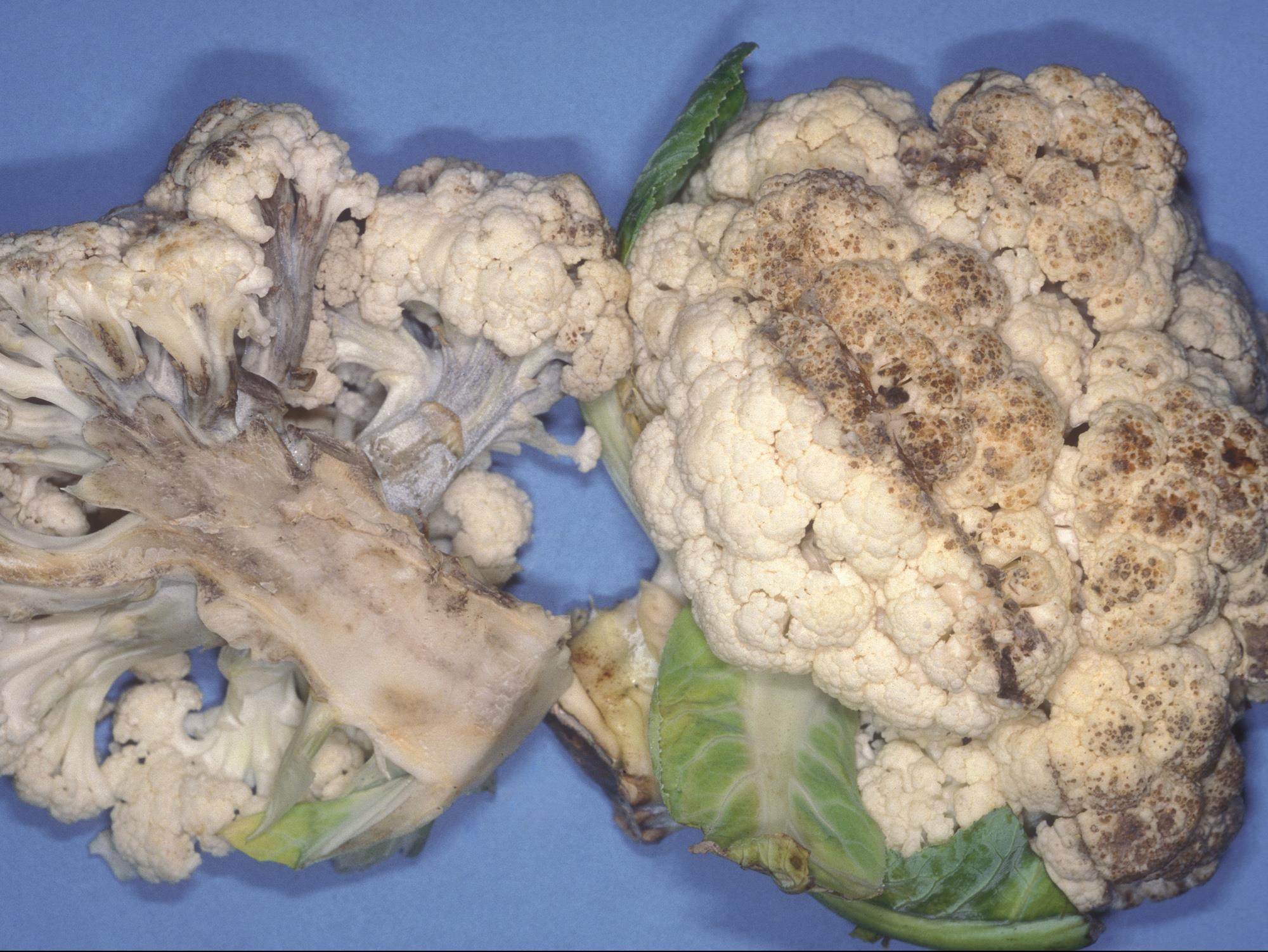 Description: Le dessus d’un chou-fleur (cv 'Chieftain') est ponctué de taches brunâtres à grisâtres. En coupant les bouquets floraux, on constate la présence d’un brunissement à noircissement des pédicelles et de la tige principale. Les observations microscopiques ont révélé la présence de l'agent pathogène Peronospora parasitica, responsable du mildiou chez les crucifères. Ces symptômes ont été observés au champ lors de la récolte en septembre. Le conseiller agricole mentionne que plus de 30 % des inflorescences sont affectées. La variété Chieftain serait plus sensible aux maladies et à la carence en bore (B).