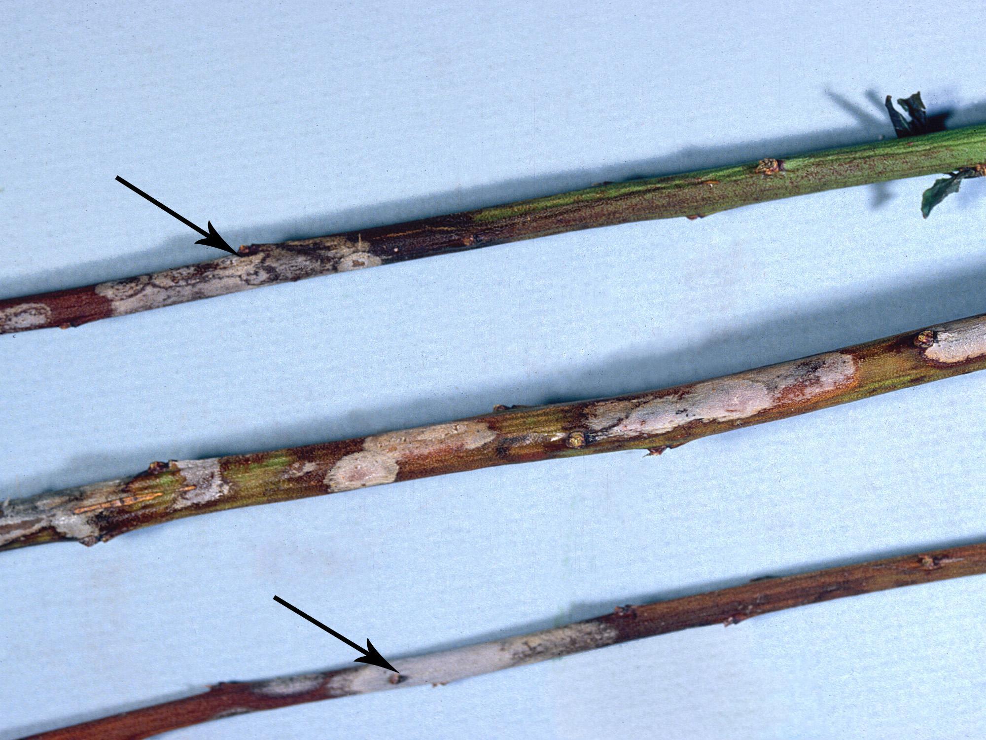 Description: Sur de jeunes tiges de bleuet en corymbe, présence de taches grisâtres encerclant les cicatrices foliaires (voir flèches). Les tiges se dessèchent et l’épiderme devient brun. Les tests de laboratoire ont révélé la présence du champignon Fusicoccum putrefaciens, responsable du chancre à Fusicoccum chez le bleuet en corymbe.