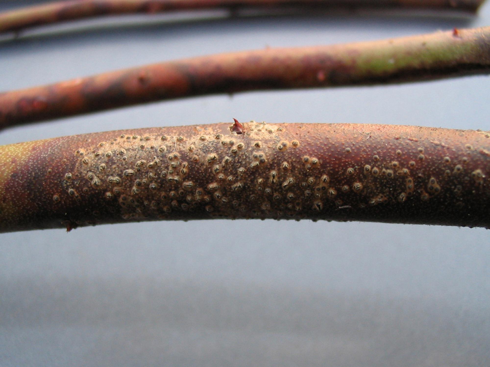 Description: Sur une jeune tige de bleuet en corymbe, présence d’une tache rouge qui évolue progressivement en un chancre elliptique dont le centre est gris. Des pycnides noires sont présentes sur l’épiderme rougi. La tache est localisée près d’une cicatrice foliaire. Ce dommage est caractéristique et causé par le champignon Fusicoccum putrefaciens, responsable du chancre à Fusicoccum chez le bleuet en corymbe.