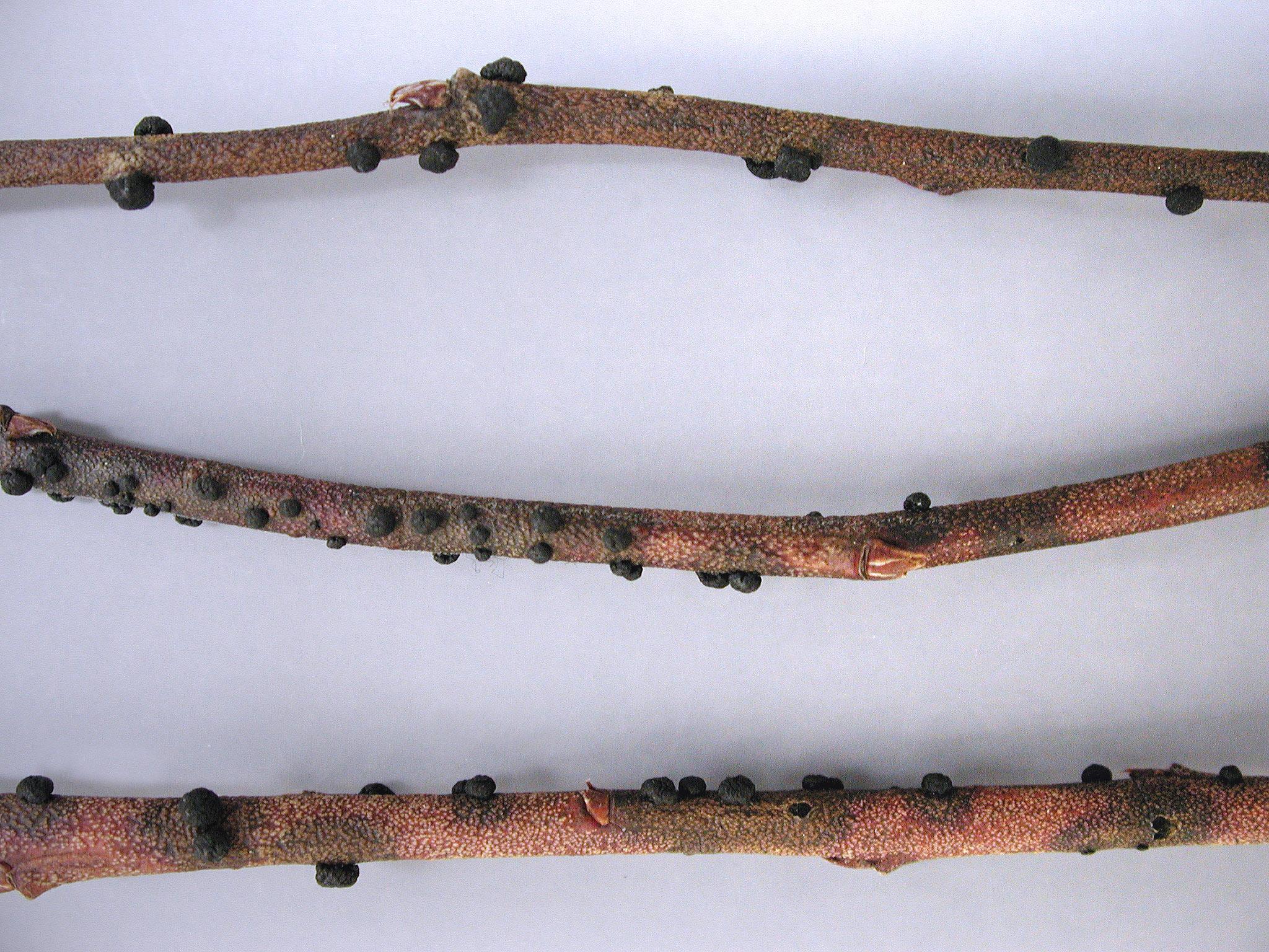 Description: Des rameaux de bleuet en corymbe (cv 'Northland') portent de nombreuses masses noires, dures et proéminentes. Un halo noirâtre entoure ces masses noires. Le test de laboratoire a permis d’identifier le champignon Protoventuria sp., responsable de la gale de tige chez le bleuet en corymbe. Il s’agit probablement de Gibbera vacciniicola.