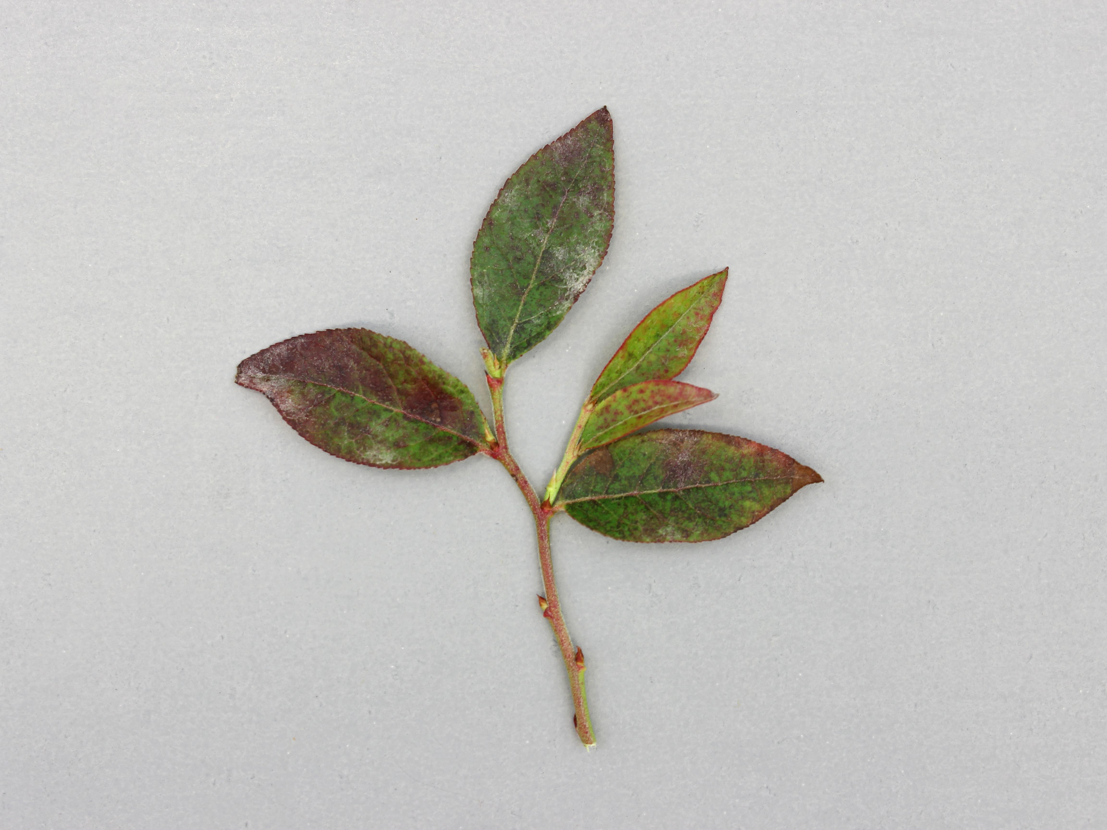 Légende: Rougissement et mycélium blanchâtre sur feuilles de bleuet nain