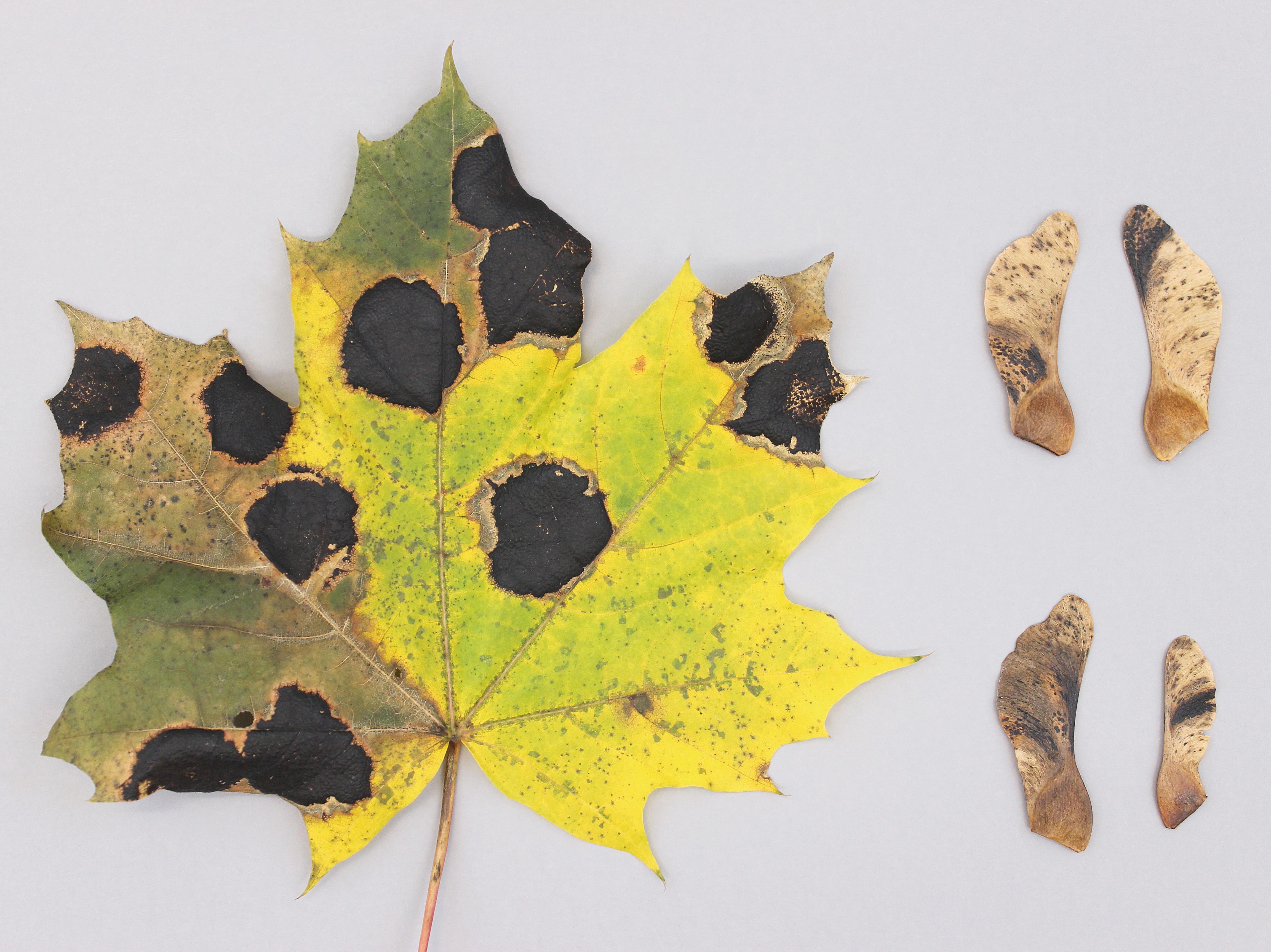 Description: Une feuille d’érable de Norvège montre de grandes taches noires plutôt circulaires et d’aspect goudronneux. Sur les samares, les taches sont beaucoup plus petites. Chez l’érable de Norvège, ce symptôme est caractéristique de la tache goudronneuse causée par le champignon Rhytisma acerinum.