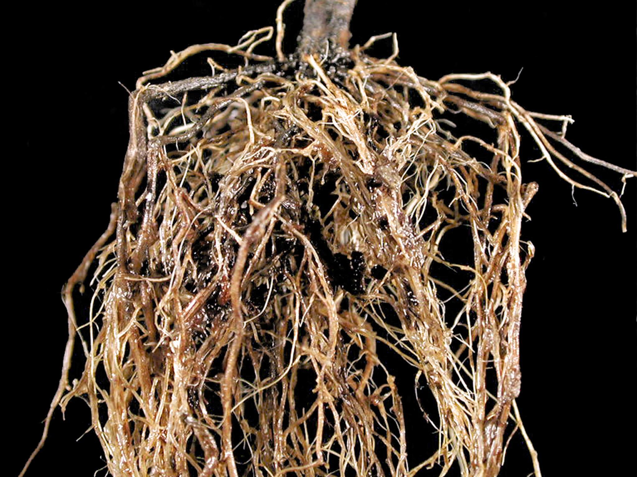 Description: Le collet d’un plant de calibrachoa (Million Bells 'Cherry Pink’) cultivé en serre est noir sur toute sa circonférence. Le noircissement s’étend sur une longueur de 3,0 cm. Les racines sont brunes à noires et visqueuses. L’ensemble du système racinaire présente cette anomalie de coloration. Les plants étaient flétris (non visible ici). Les observations microscopiques ont révélé la présence du champignon Berkeleyomyces basicola (syn. Thielaviopsis basicola), responsable de la pourriture noire des racines. Le champignon Pythium a également été détecté des racines. Il cause le pourridié pythien. La dégradation du système racinaire est probablement liée à la synergie de ces deux champignons.