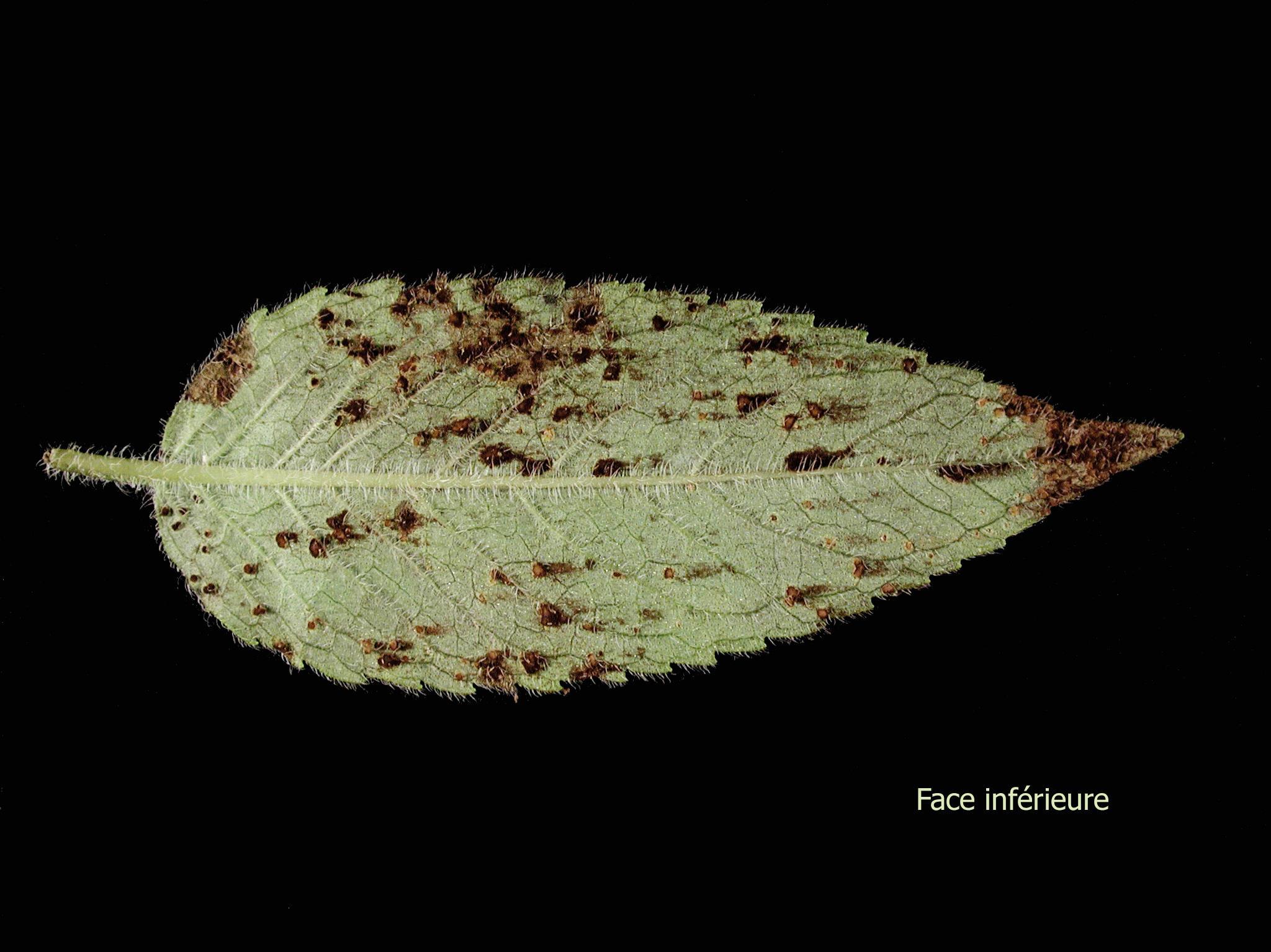 Description: À la face inférieure d’une feuille de monarde, présence de pustules surélevées brunes. Chaque pustule se trouve vis-à-vis une tache à la face supérieure. Tous les niveaux de feuille sont affectés. Les observations microscopiques ont révélé la présence d’urédospores et de téliospores du champignon Puccinia sp., responsable d’une rouille. Chez la monarde, quelques espèces de Puccinia sont rapportées. Le conseiller agricole mentionne que tous les plants de la pépinière sont affectés.