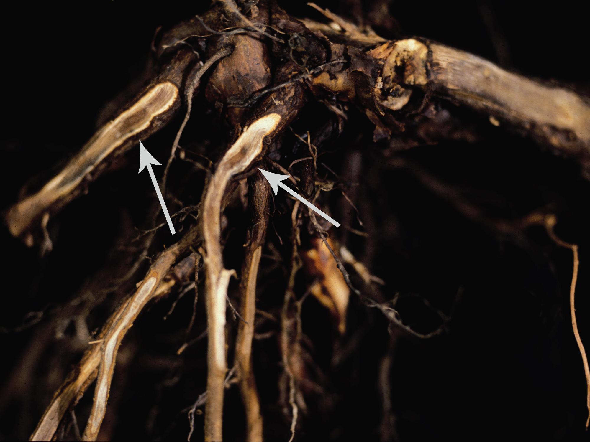 Description: Les racines principales de ce framboisier (cv 'Madawaska') présentent un brunissement de la partie centrale (stèle). Les tests de laboratoire ont révélé la présence de Phytophthora rubi, responsable du pourridié phytophthoréen chez le framboisier.