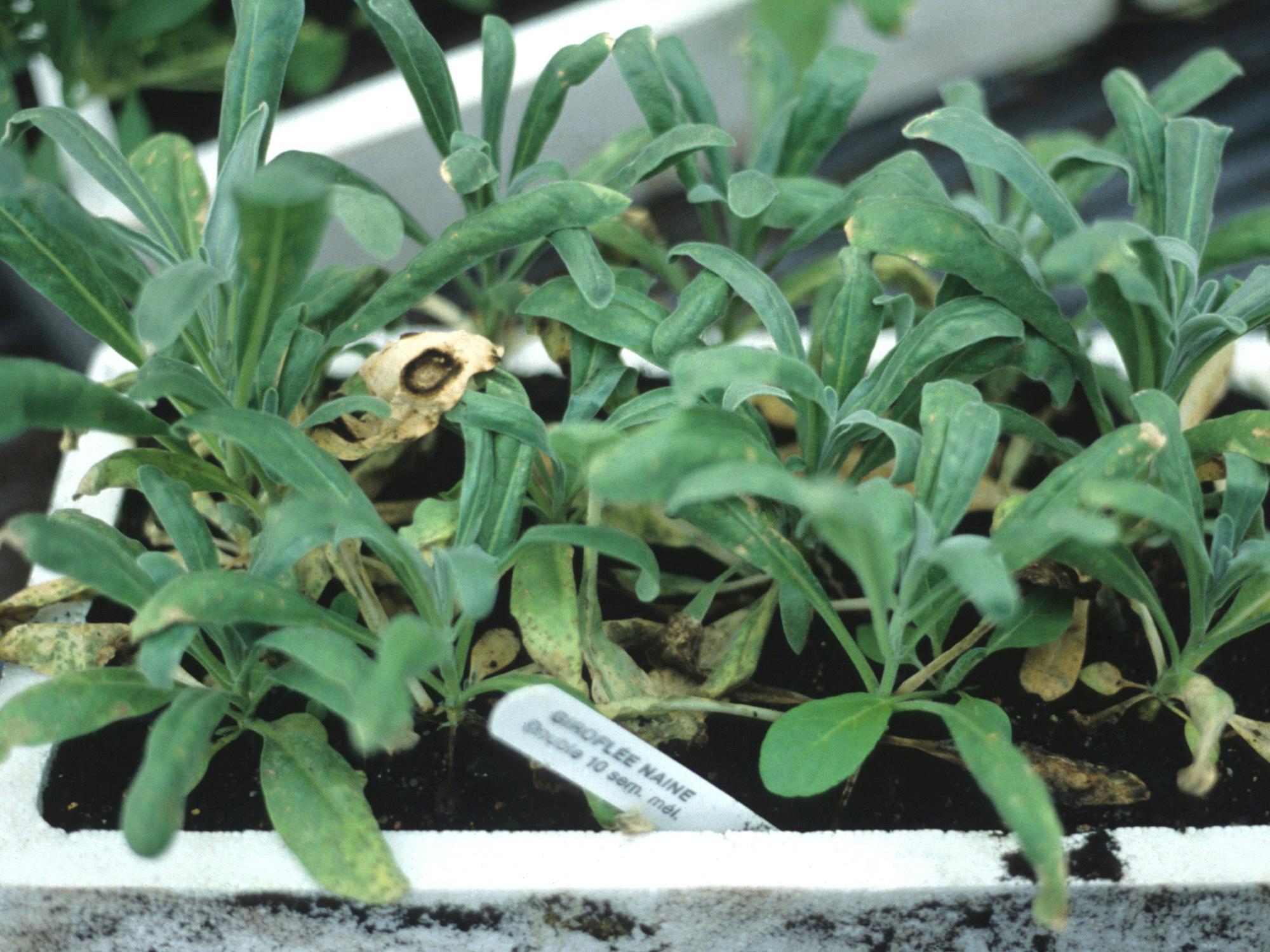 Légende: Déformation et taches sur feuilles de giroflées naines