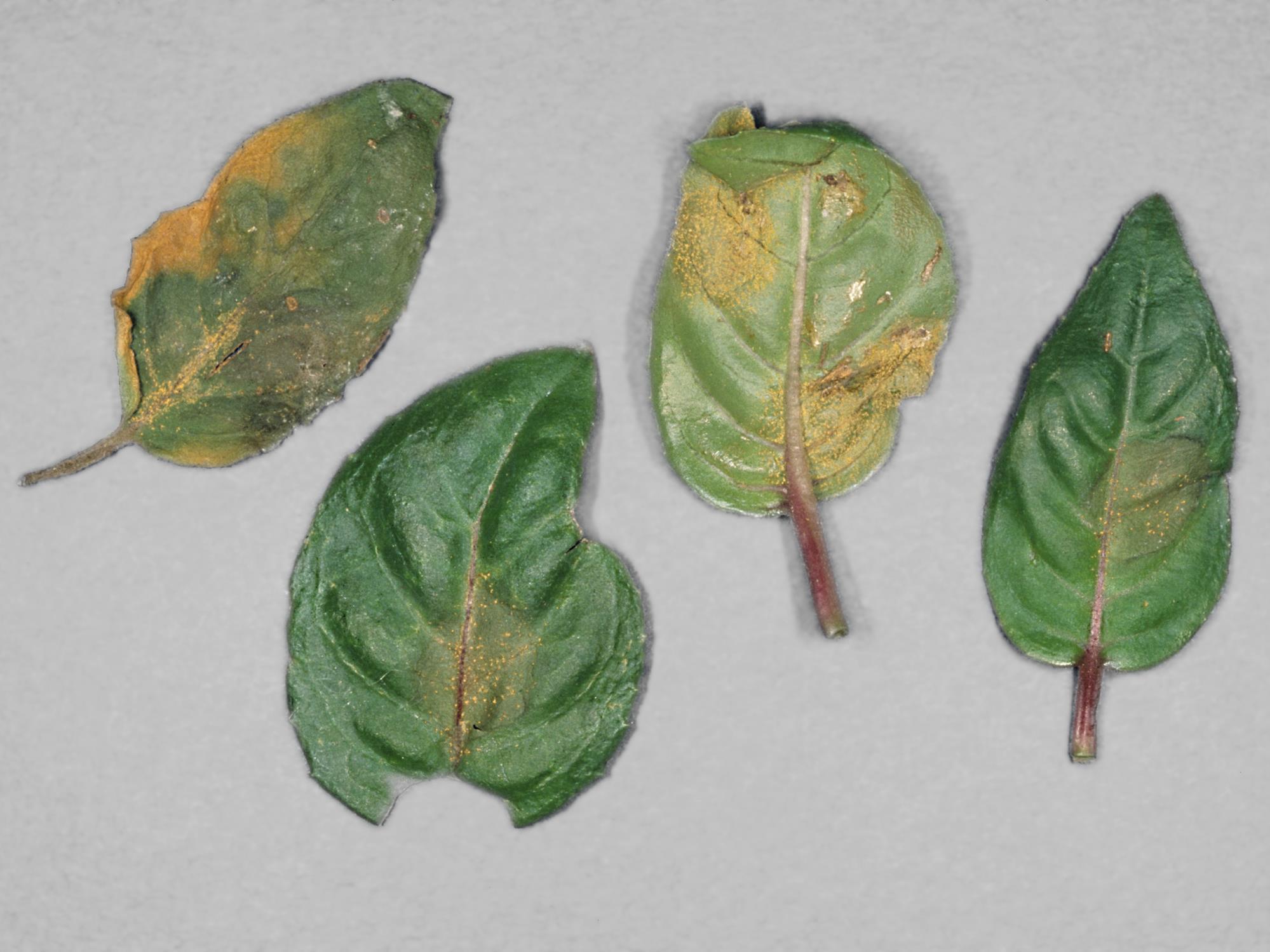 Description: Des feuilles de fuchsia montrent des taches grisâtres ponctuées de pustules orange. Les feuilles sont légèrement gaufrées. Le symptôme est présent aux faces supérieure et inférieure. Les observations microscopiques ont révélé la présence d’urédospores du champignon Pucciniastrum sp., responsable d’une rouille. Chez le fuchsia, P. epilobii est rapporté.