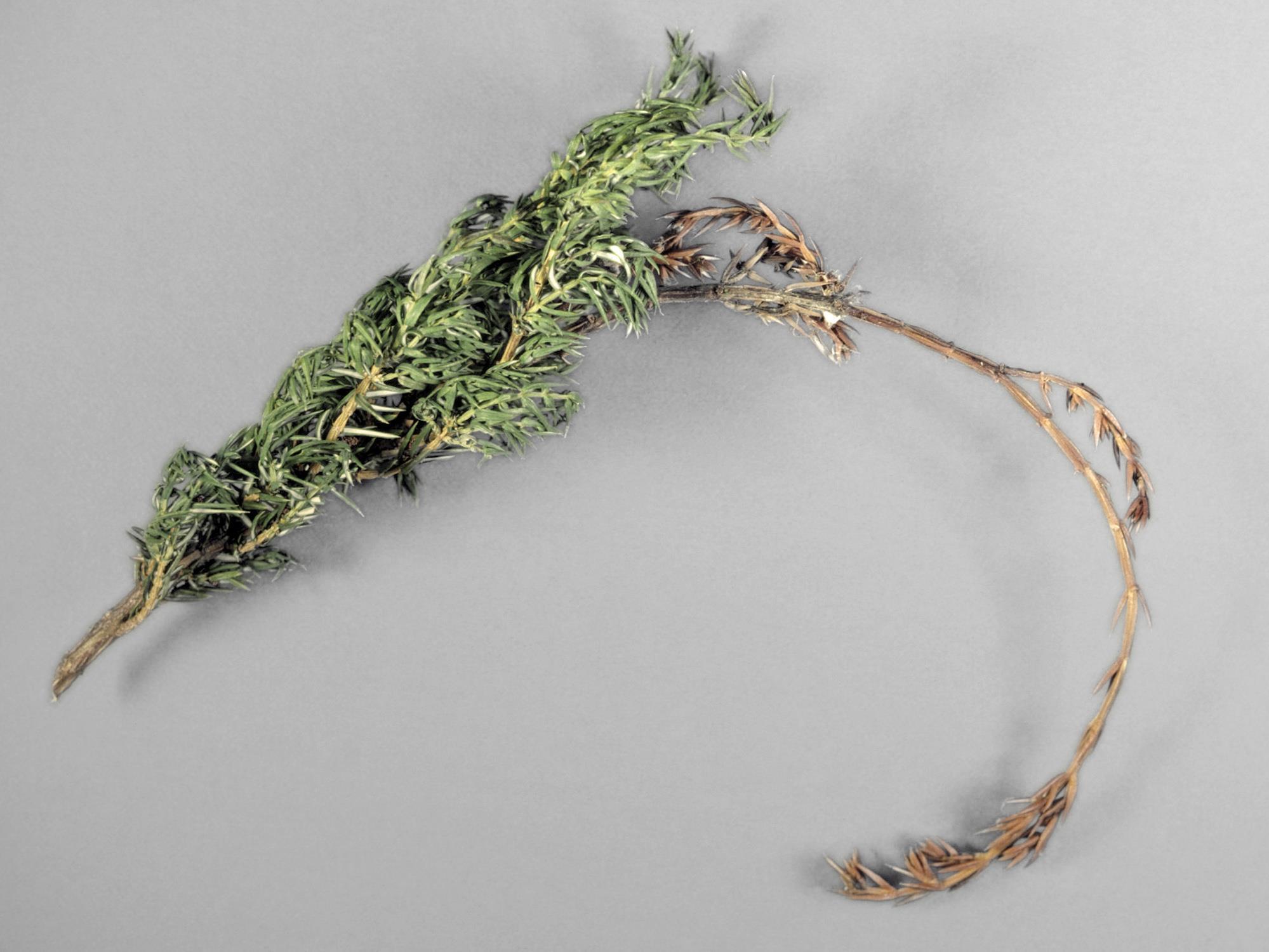 Description: Une jeune pousse d’un genévrier commun est complètement brûlée et dépérit. Les aiguilles sont brunes et d’une apparence sèche. La brûlure débute à l’extrémité de la pousse et n’affecte que celle-ci. Des fructifications noires sont présentes sur la tige (non visible ici). Les observations microscopiques ont révélé la présence de pycnides et de spores α et β du champignon Phomopsis juniperivora, responsable de la brûlure phomopsienne chez le genévrier.