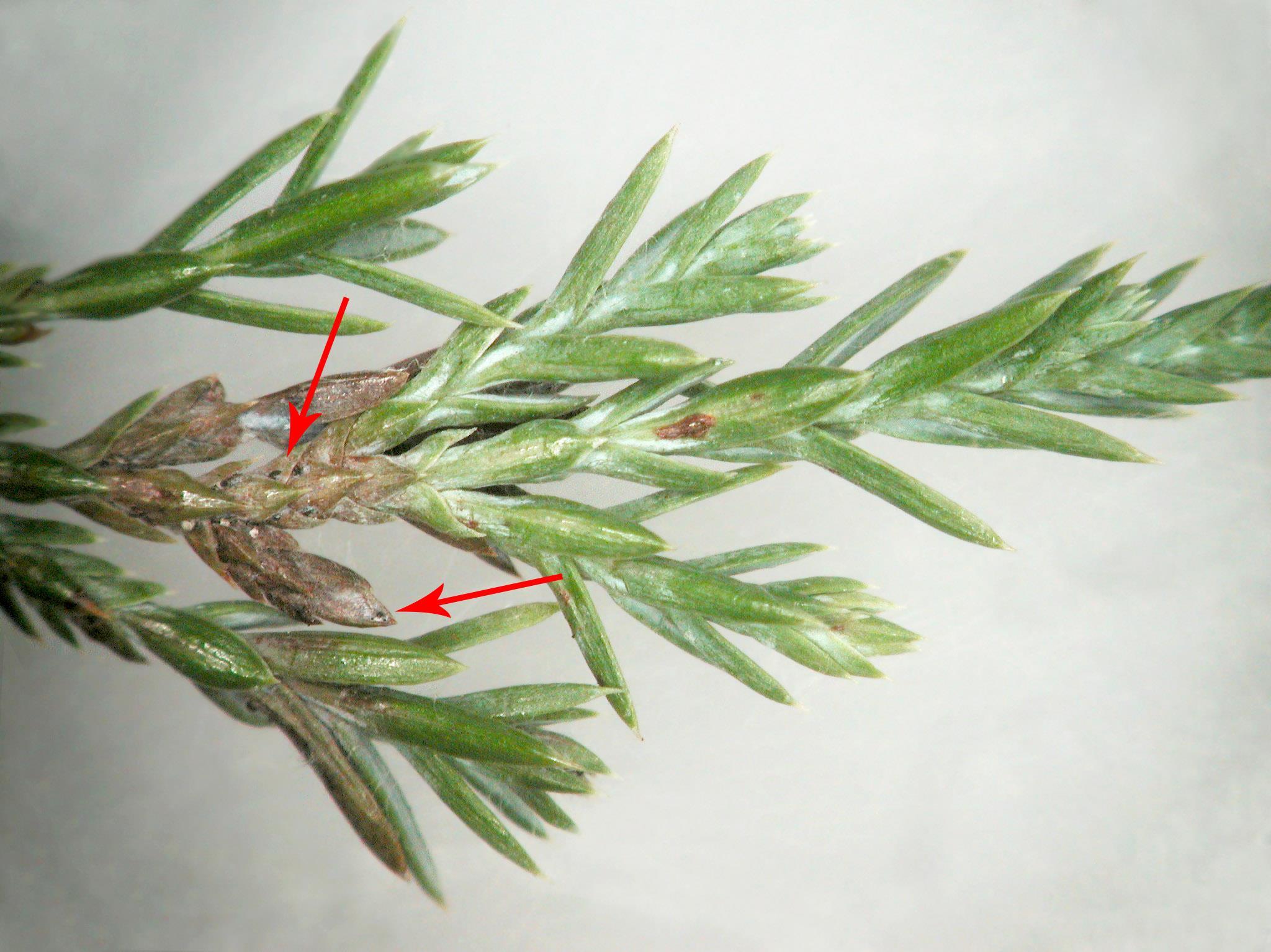 Description: Les feuilles d’un genévrier de Virginie (cv 'Skyrocket') présentent des brûlures brunes, d’une apparence sèche et couvrant toute la surface du limbe. Les brûlures débutent à l’extrémité des branches et se prolongent sur une longueur moyenne de 20 cm. Le feuillage peut également présenter une anomalie de coloration vert pâle à grisâtre. À la base des feuilles, des fructifications noires sont visibles (voir flèches). La tige présente un brunissement interne correspondant aux brûlures du feuillage. Lorsque le feuillage est vert, les tissus internes de la tige sont sains. Les observations microscopiques ont révélé la présence de pycnides et de spores du champignon Kabatina juniperi, responsable de la brûlure des aiguilles chez le genévrier.