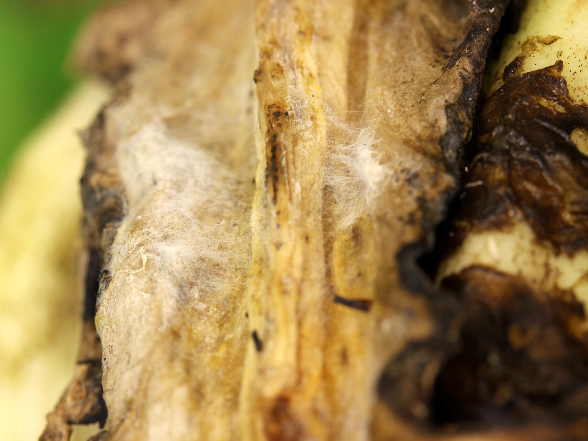 Description: Sur un chou pommé provenant d’un champ, une vue rapprochée montre la présence d’un mycélium blanchâtre sur une feuille pourrie. Le chou pommé présente une pourriture molle brune à noire qui débute sur les feuilles externes et qui progresse vers les feuilles internes de la pomme (non visible ici). Les tests de laboratoire ont révélé la présence du champignon Rhizoctonia solani, responsable de la pourriture de la pomme chez les crucifères. Des bactéries secondaires ont également été observées et ont sûrement contribué à la dégradation des tissus.