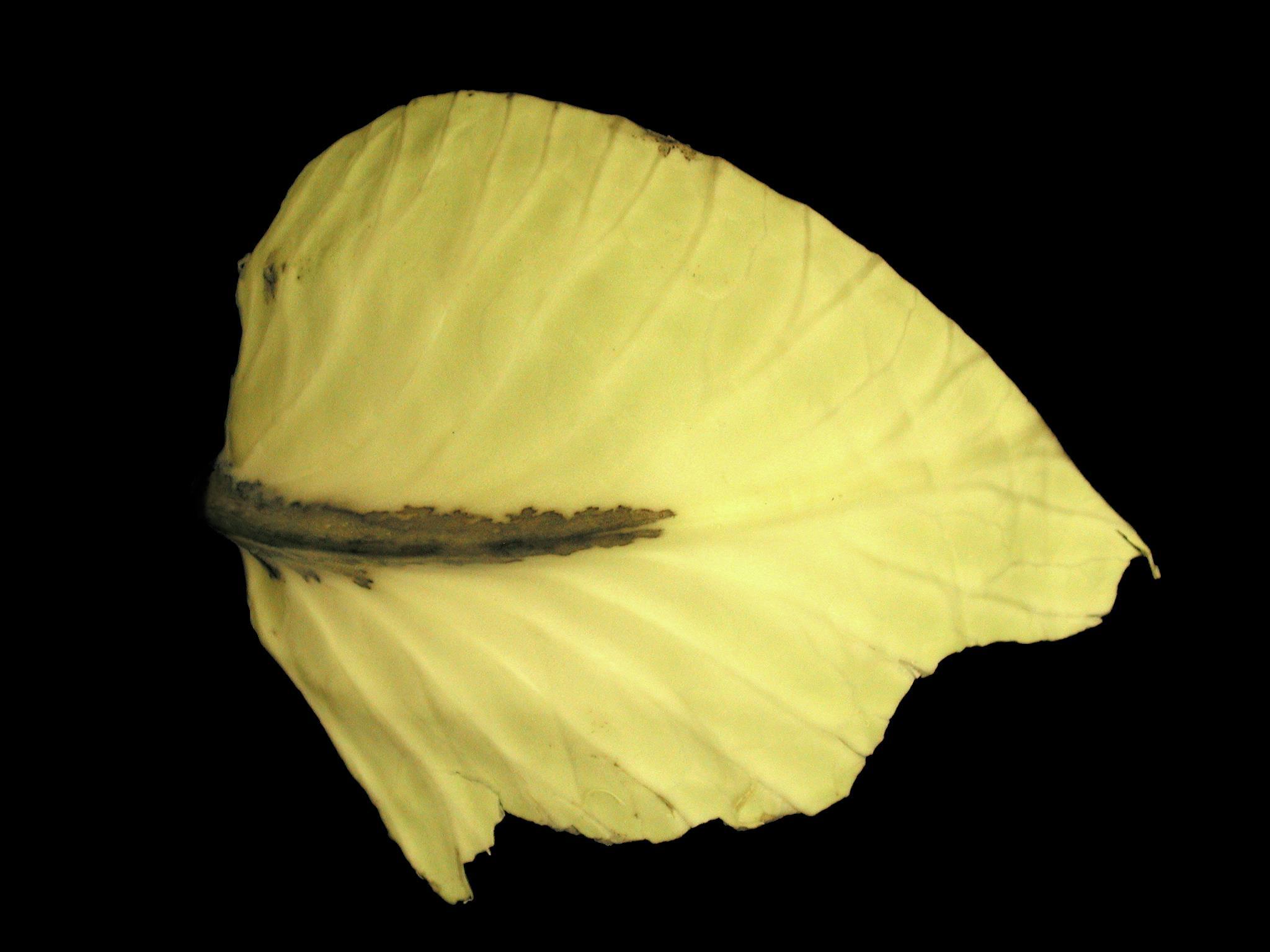 Description: Sur un chou pommé (cv 'Loughton') provenant d’un entrepôt la pourriture débute à la base de la feuille, au point d’attache sur la tige, et progresse ensuite sur le limbe en longeant la nervure principale. Le Service national d'identifications fongiques d'Agriculture et Agroalimentaire Canada (AAC) a identifié Phytophthora brassicae, l'agent pathogène responsable de la pourriture en entreposage chez les crucifères.