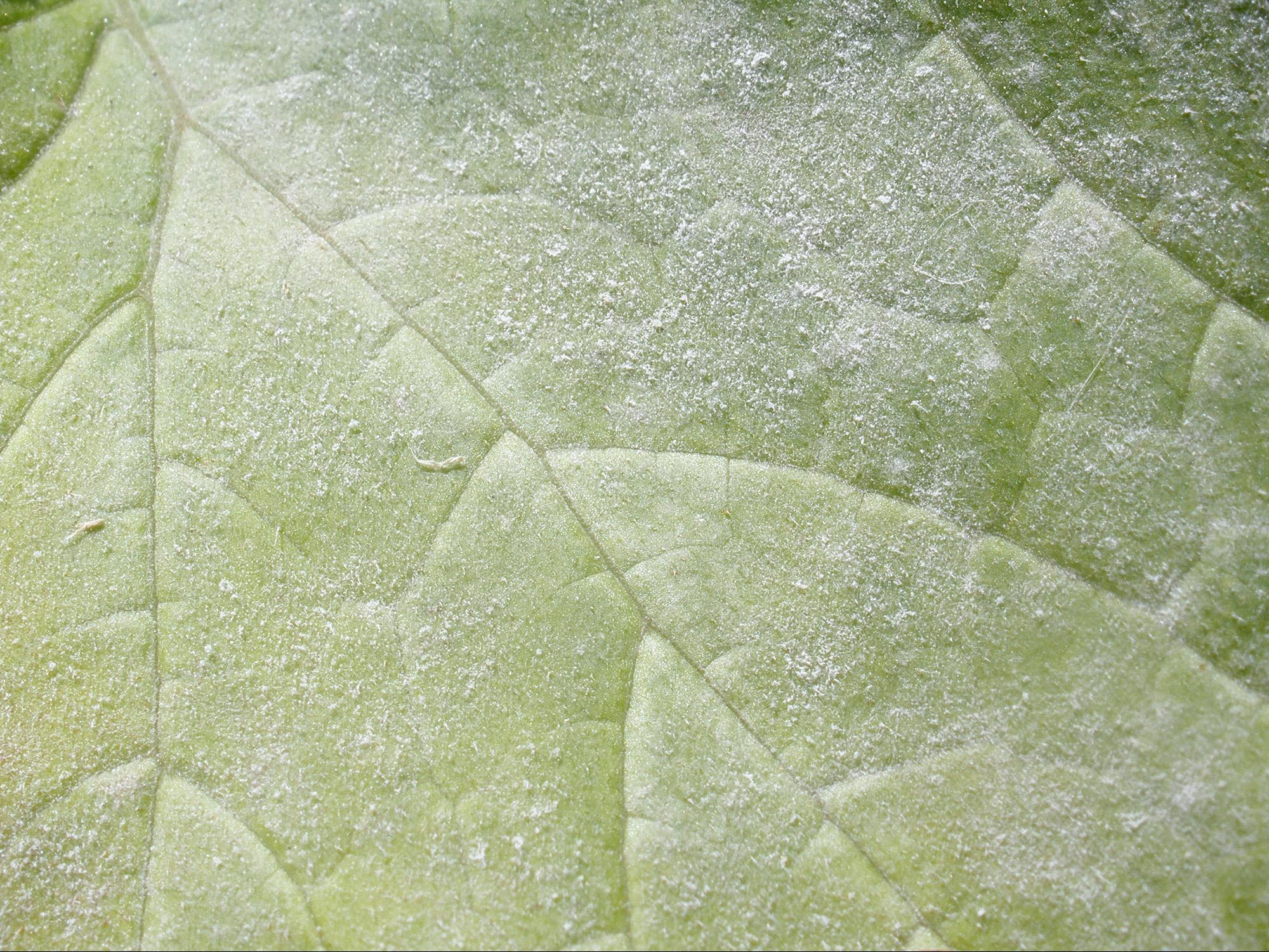 Description: Une vue rapprochée de la face supérieure d’une feuille de courgette montre la présence d'un mycélium blanc, dense et poudreux qui apparaît sous la forme de taches plutôt rondes et blanchâtres. Les observations microscopiques ont révélé la présence de conidiophores portant de longues chaînes de conidies caractéristiques d’un champignon causant la maladie du blanc (oïdium). Il s’agit probablement de Sphaerotheca fuliginea.