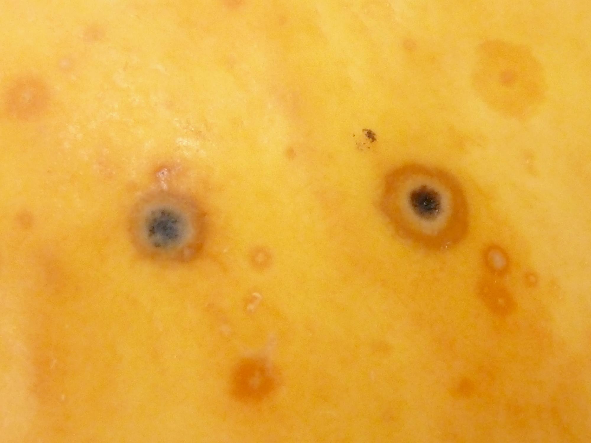 Description: Sur l'épiderme d’un potiron provenant d’un champ, une vue rapprochée montre la présence de taches orangées plutôt circulaires et légèrement surélevées. Le centre des taches est blanc avec un point noir au milieu. Les observations microscopiques ont révélé la présence de setae et de conidies du champignon Colletotrichum sp., responsable de l’anthracnose chez les cucurbitacées. Il s'agit probablement de Colletotrichum orbiculare.