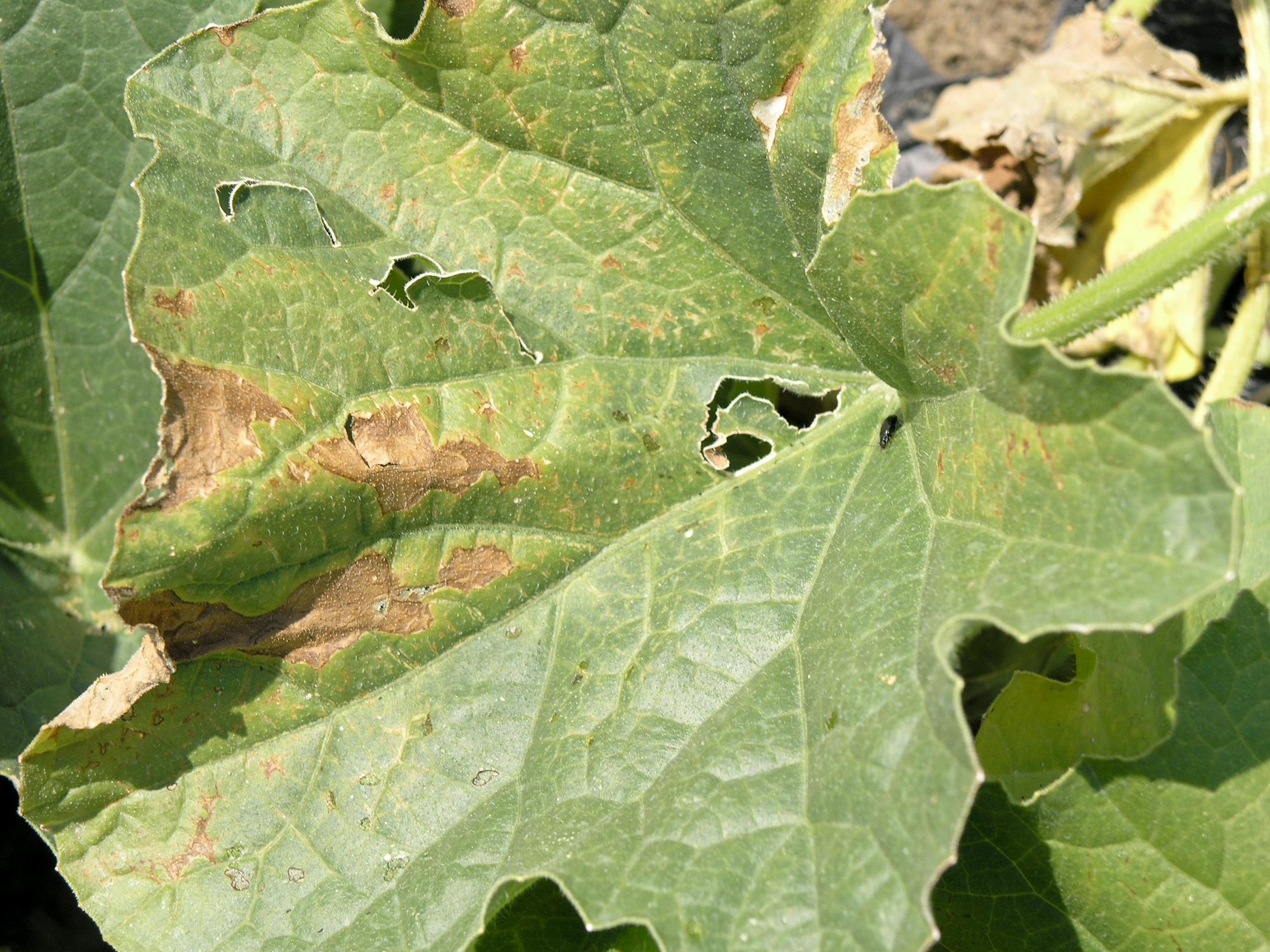 Description: Sur la feuille d’un melon brodé, présence de brûlures irrégulières débutant à la marge et progressant entre les nervures. Un jaunissement est parfois visible autour des brûlures. Les plages brûlées occupent généralement un seul côté du limbe et correspondent au brunissement d’un côté des pétioles (non visible ici). Les tests de laboratoire ont révélé la présence du champignon Fusarium sp., responsable de la fusariose vasculaire chez les melons. Il s’agit probablement de Fusarium oxysporum f. sp. melonis.