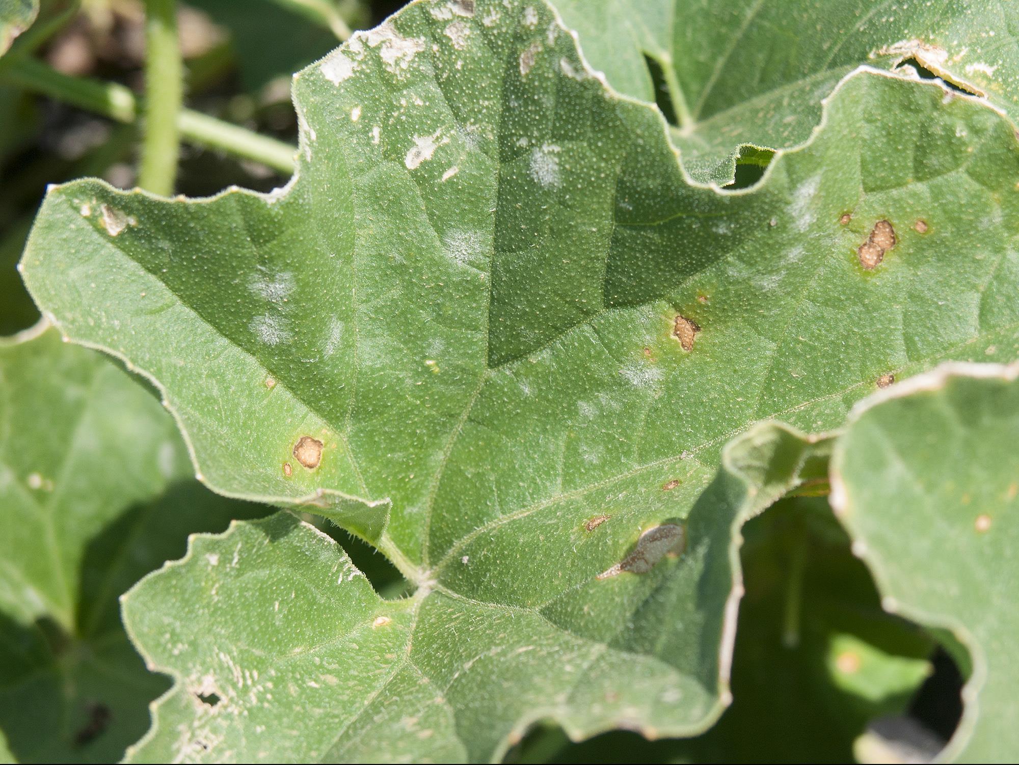Description: À la face supérieure d'une feuille de melons brodés (cantaloup), présence d'un mycélium blanc, dense et poudreux qui apparaît sous la forme de taches plutôt rondes et blanchâtres. Les observations microscopiques ont révélé la présence de conidiophores portant de longues chaînes de conidies caractéristiques d’un champignon causant la maladie du blanc (oïdium). Il s’agit probablement de Sphaerotheca fuliginea.