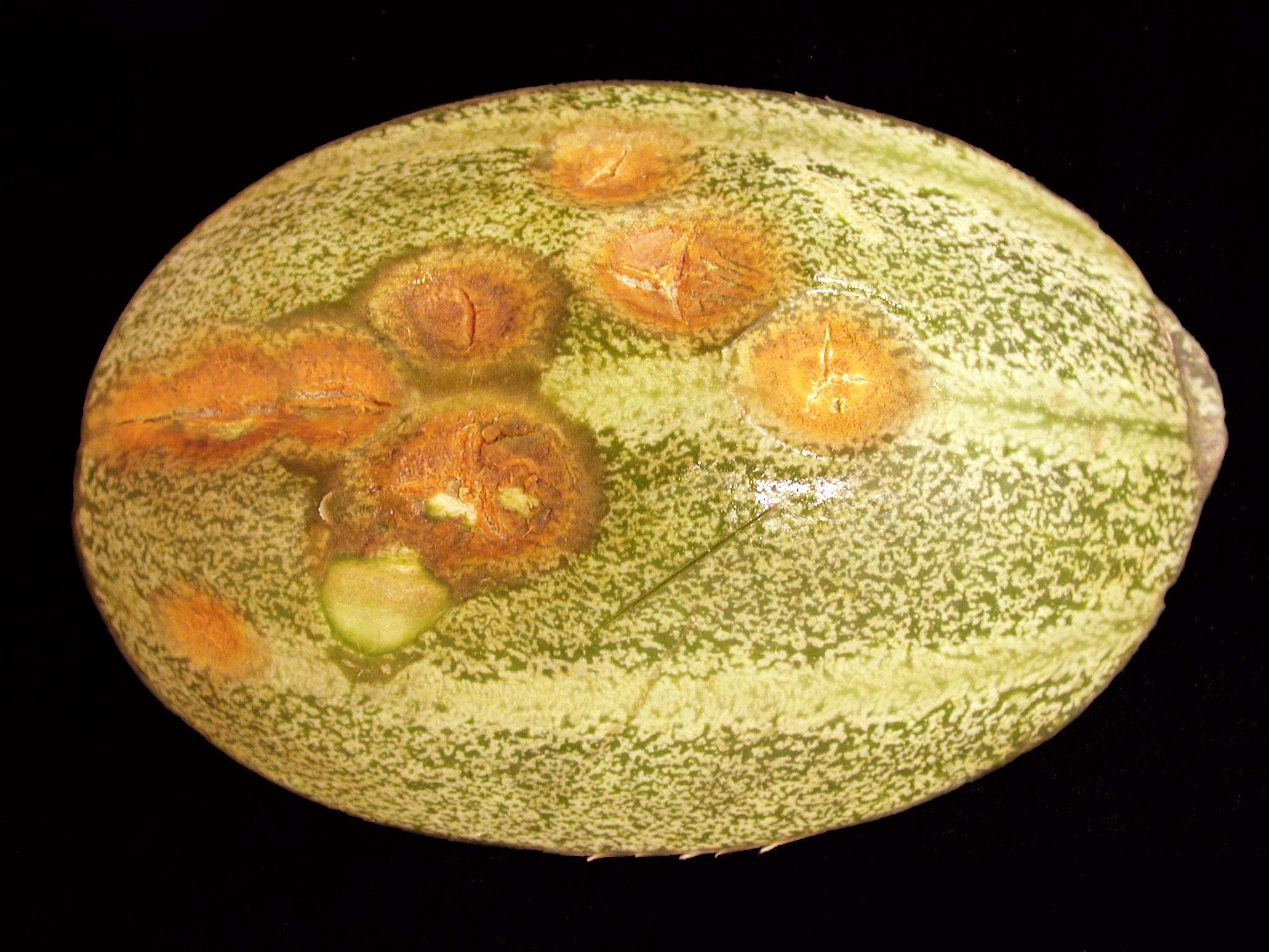 Description: Sur l'épiderme d’un jeune melon d’eau, présence de taches rose orangé, plutôt circulaires, surélevées et mesurant entre 10 à 15 mm de diamètre. Le centre des lésions tend à se fendre. Les observations microscopiques ont révélé la présence de setae et de conidies du champignon Colletotrichum sp., responsable de l’anthracnose chez les cucurbitacées. Il s'agit probablement de Colletotrichum orbiculare.