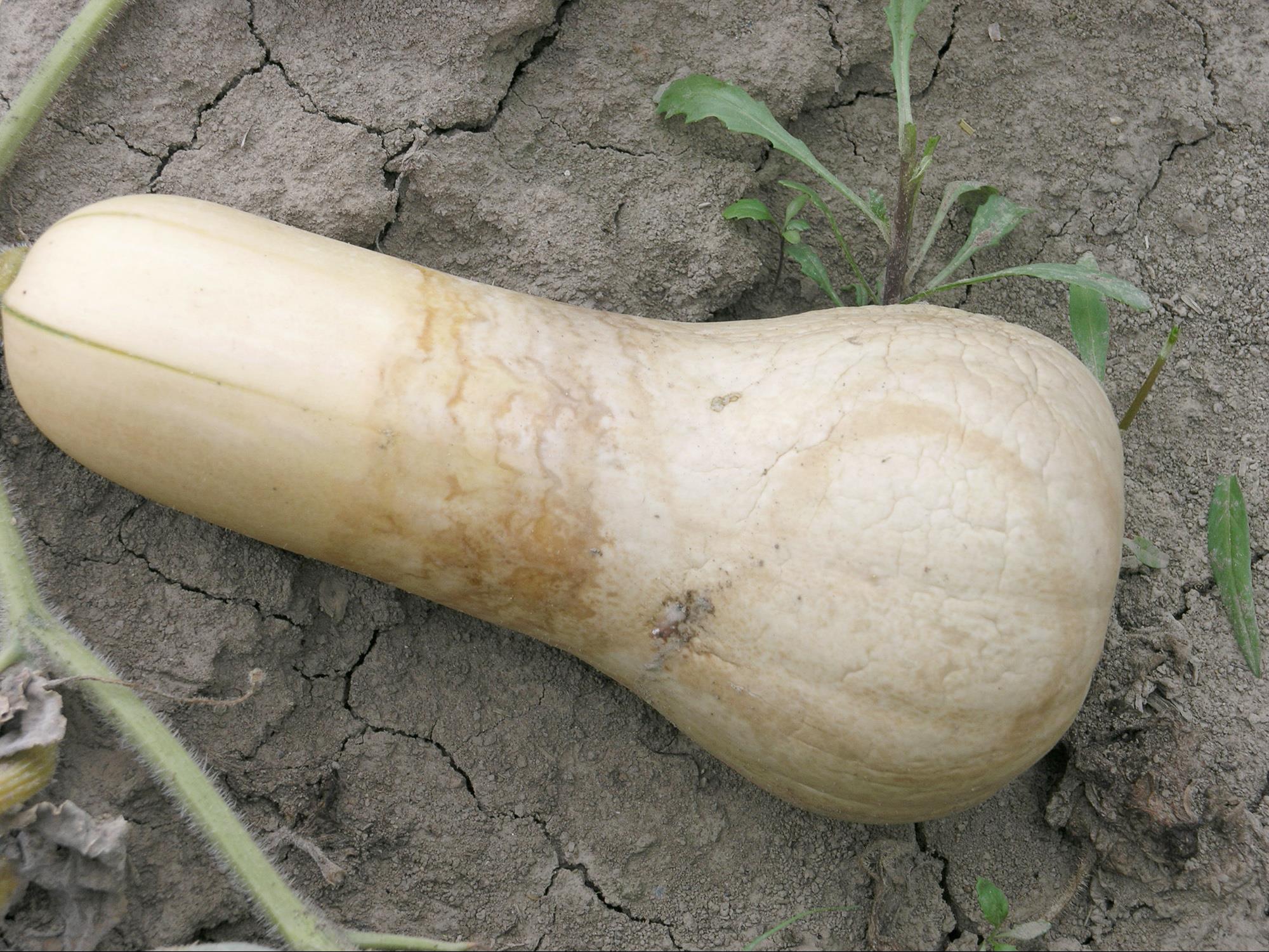 Description: Sur une courge musquée 'Butternut' provenant d’un champ, présence d’une pourriture molle débutant dans la partie basale du fruit. L’épiderme affecté est pâle et mou. La pourriture progresse et des lignes sinueuses montrent une démarcation nette entre la partie saine et pourrie. La chair du fruit est décomposée, pâle et humide (non visible ici). Une forte odeur acidulée émanait du fruit. Les tests de laboratoire ont révélé la présence du champignon Geotrichum candidum, responsable de la pourriture sure. Aucune bactérie n’a été détectée du fruit. Le conseiller agricole mentionne qu’au champ, les plants affectés sont en foyer et représentent 3 % de la production. Les fruits pourris reposaient sur un sol dont le drainage est passable.