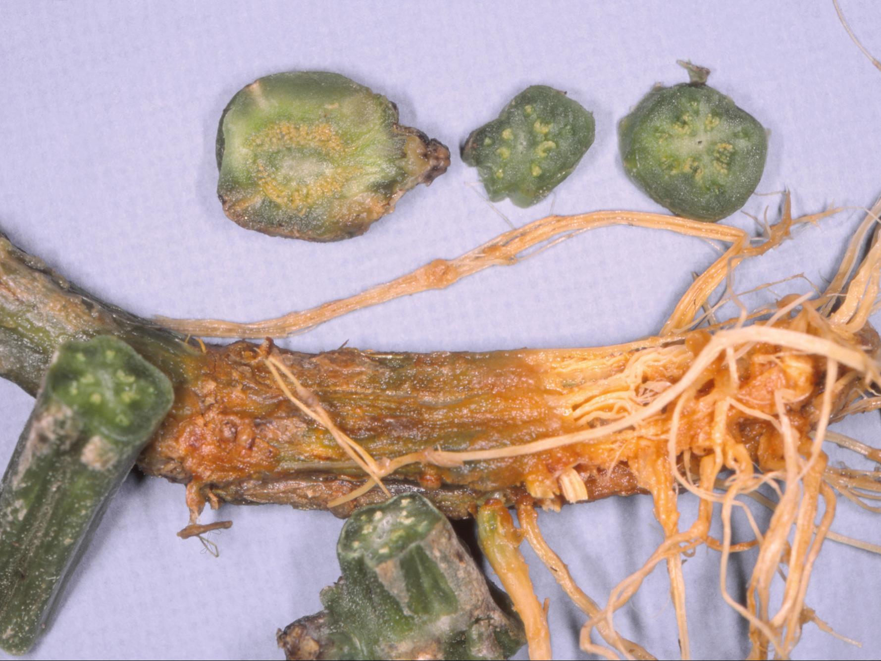 Description: Sur un plant de concombre de champ (cv 'Suprami'), le collet et les racines présentent une pourriture humide de couleur rouille. Le système vasculaire de la tige était de couleur rouille (non visible ici). Les tests de laboratoire ont révélé la présence du champignon Verticillium sp. dans le système vasculaire de la tige. Ce champignon est responsable du flétrissement verticillien (verticilliose). Il est à noter qu’en plus de Verticillium, les champignons Pythium sp. (pourridié pythien) et Rhizoctonia sp. (rhizoctone) ont été isolés des racines et du collet. Le flétrissement du plant est probablement causé par la synergie de ce complexe fongique. Au champ, environ 15 % des plants sont affectés et les symptômes sont apparus au stade fructification.